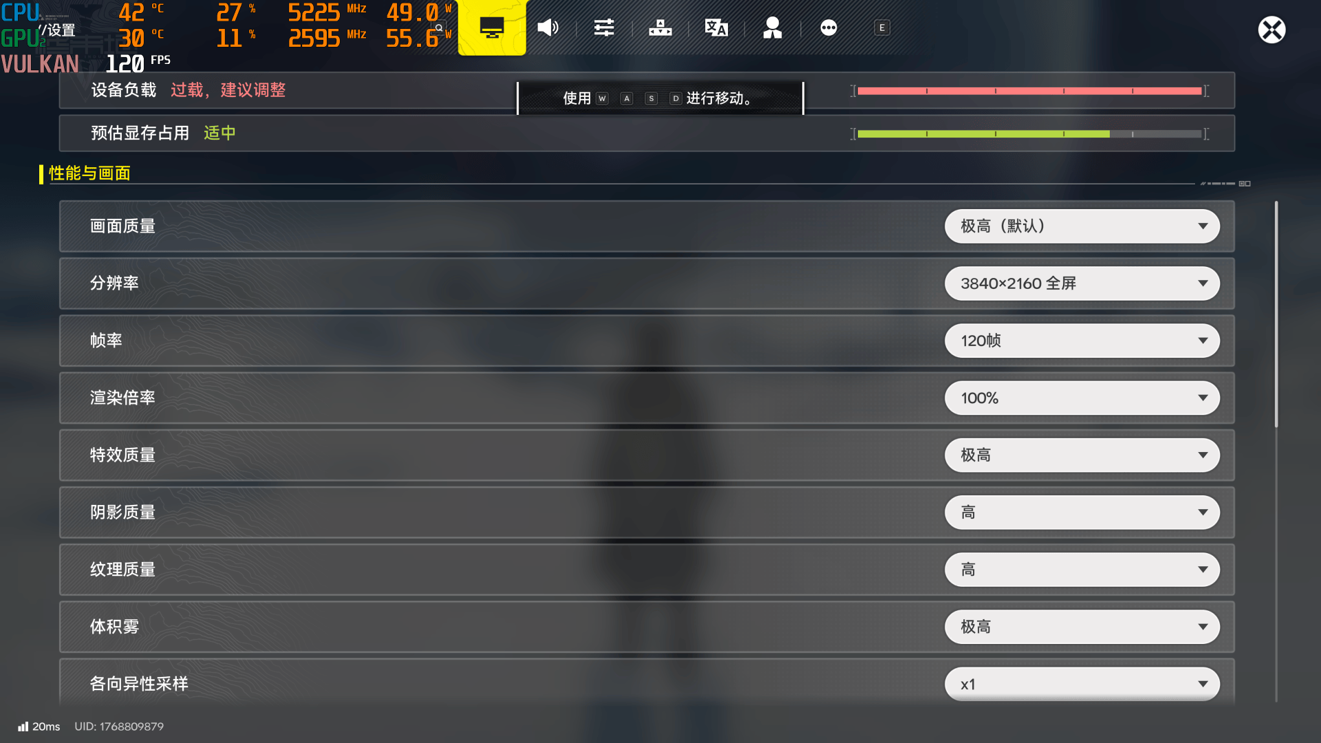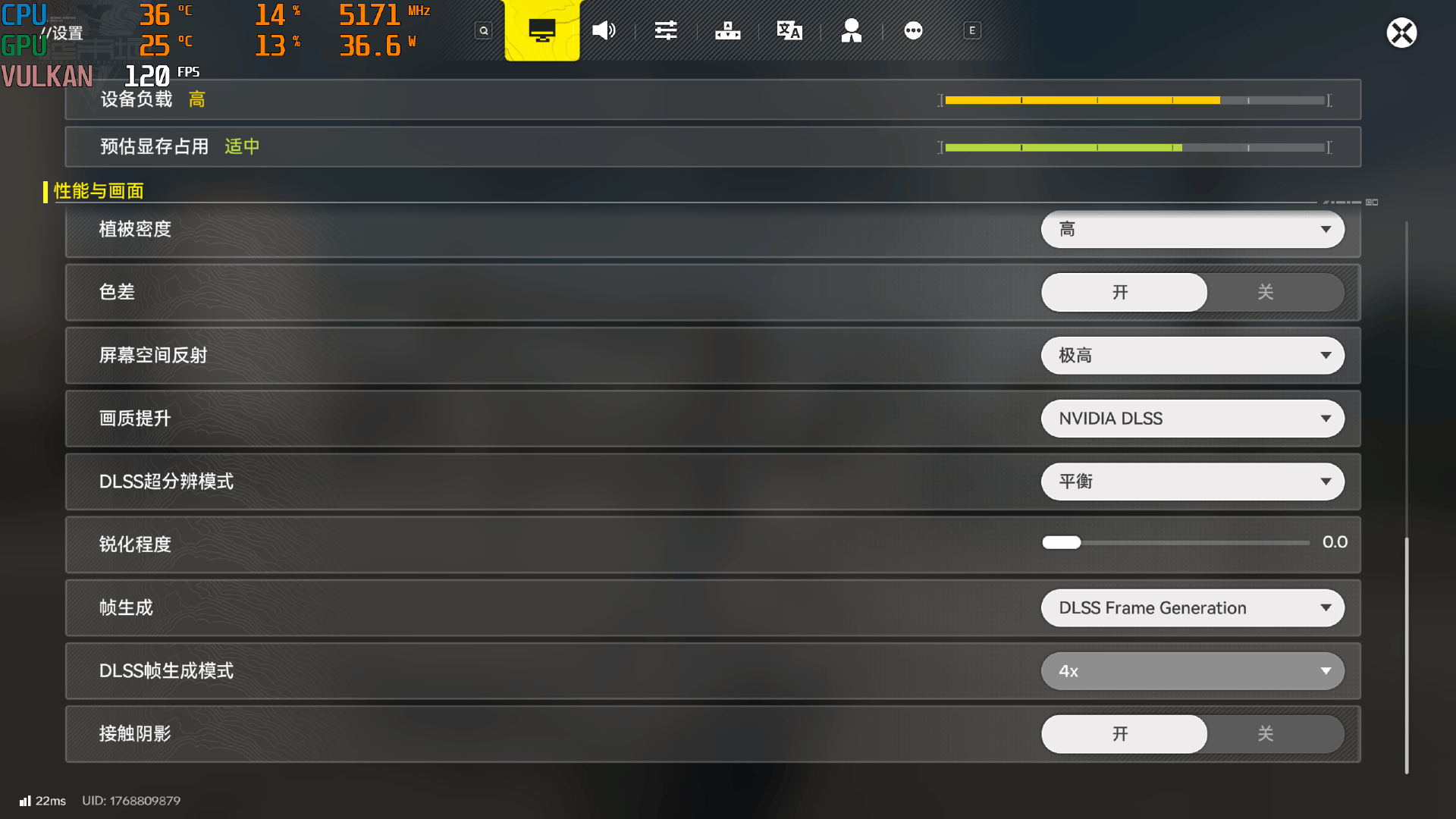 通过画面设置可以看到,《明日方舟:终末地》的画面设置有点类似《原神》,还贴心的用上了设备负载等提示(不过对于PC端不太适用),同时画面的设置项目也非常多,尤其是还支持最新的DLSS 4.5技术。