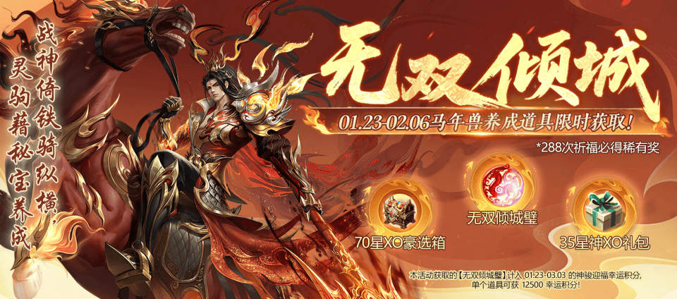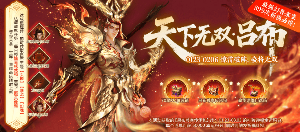祈福是拿SS级马年兽的核心,分吕布、貂蝉两个场次,50级以上玩家都能参加,目前两场活动正同步进行中。吕布场活动持续到2月6日23:59,消耗温侯战印或无双威令抽奖,不仅能直接出吕布尊享传承包,还能顺带拿70星XO、豪华词缀箱这些养成材料。福利方面别漏了,每天登活动页就能领免费成就箱,累计1份至臻奖励换10份高星XO兑换函,凑够2份还能解锁虓虎之勇头像框,颜值战力双收。建议优先囤够道具再抽,集中资源冲目标,比零散抽效率高太多。