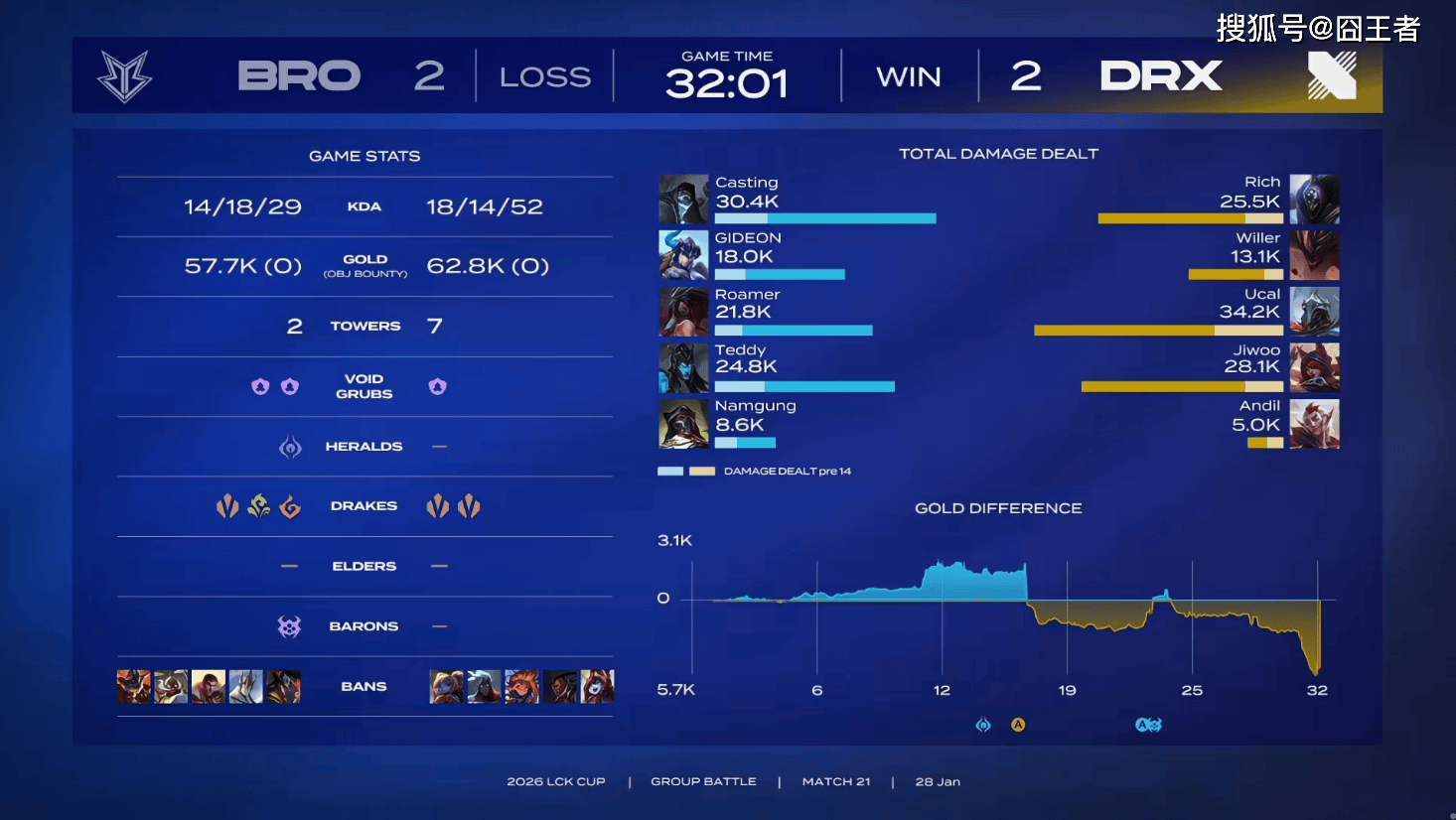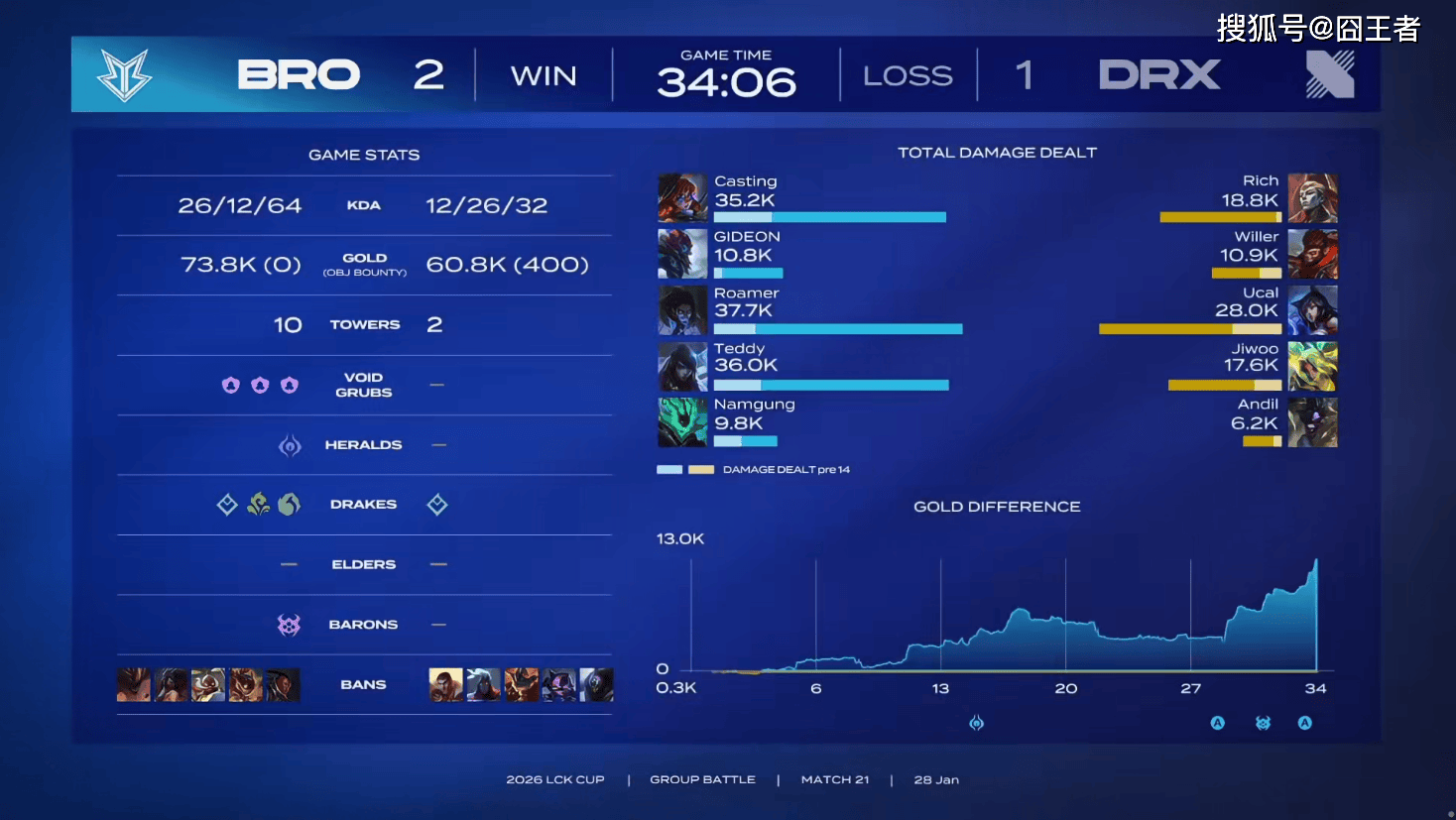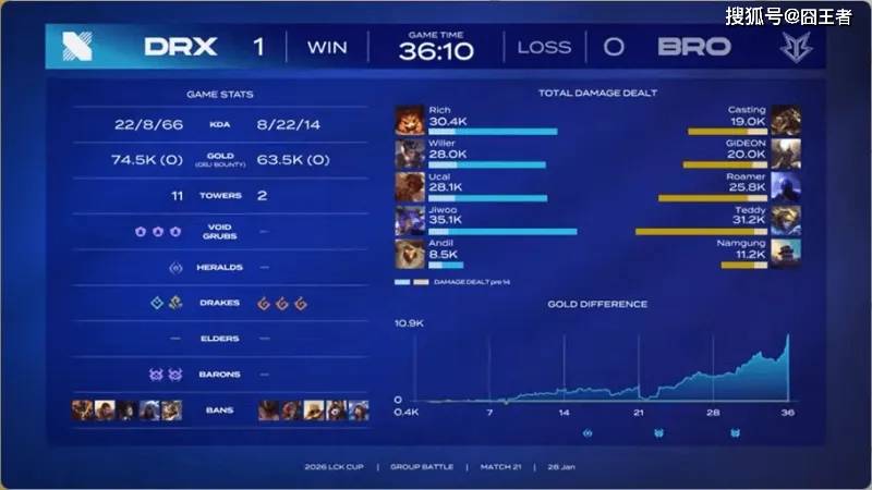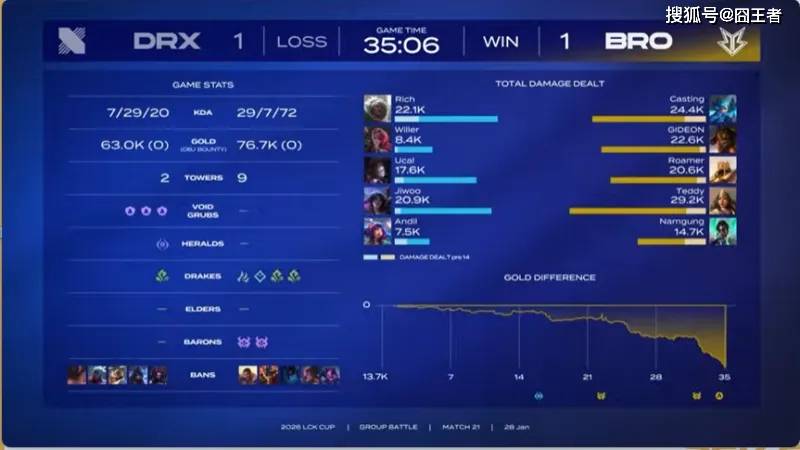 结果第二局比赛,BRO也打出了碾压局。5分钟左右,沙皇交闪现击杀丝血发条,拿下一血;15分钟左右,小龙团BRO打出1换2,随后拿下小龙;22分钟左右,DRX四打五完成1换3,随后拿下大龙;24分钟左右,BRO再次主动发难,但又被打出1换3;26分钟左右,BRO拿下小龙并打出0换2;29分钟左右,BRO开打大龙,DRX赶来却被打出2换4;31分钟左右,BRO击杀妮蔻拿下龙魂,随后在上半区打出0换3,拿下大龙;最终35分06秒,DRX拼死一搏无济于事,随后BRO顺利一波
