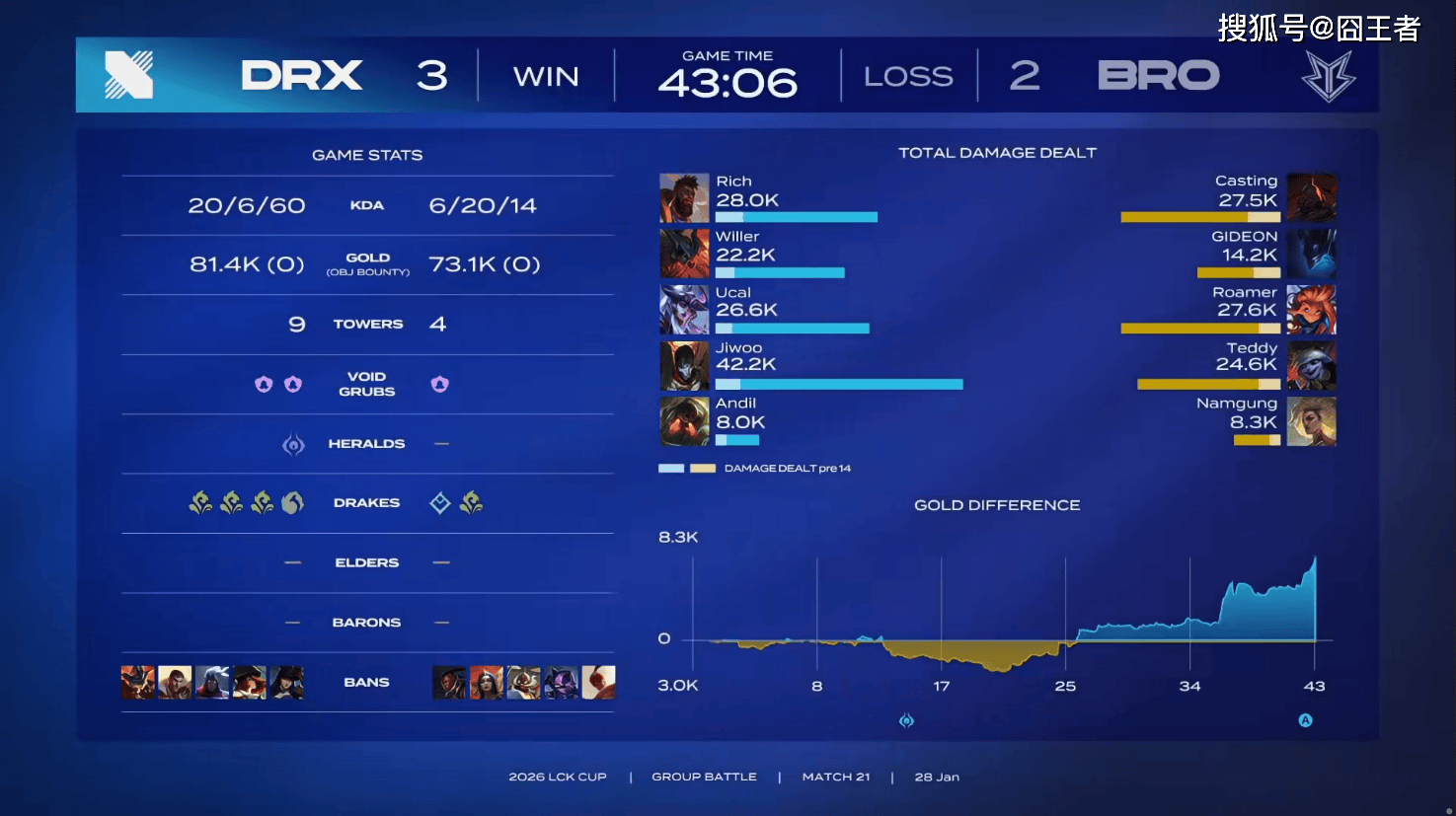 第一局比赛,DRX蓝色方,禁用:兰博、杰斯、发条、韦鲁斯、飞机,选用:Rich纳尔、Willer、Ucal岩雀、Jiwoo芸阿娜、Andill巴德;BRO红色方,禁用:石头人、蔚、沙皇、露露、妮蔻,选用:Casting鳄鱼、GIDEON潘森、Roamer瑞兹、Teddy EZ、Namgung布隆