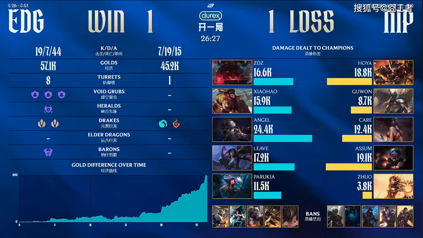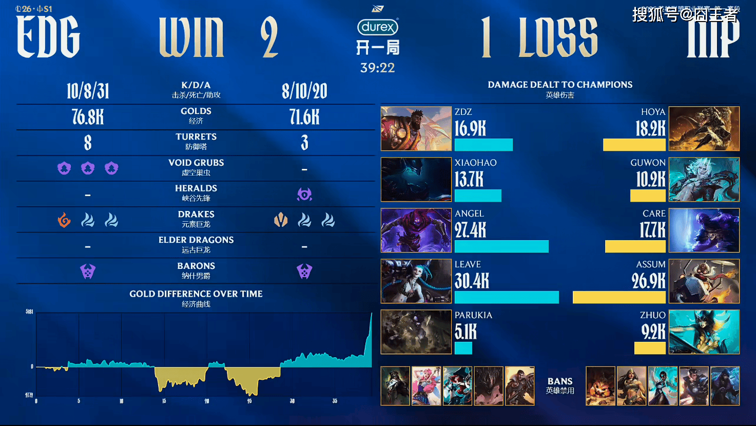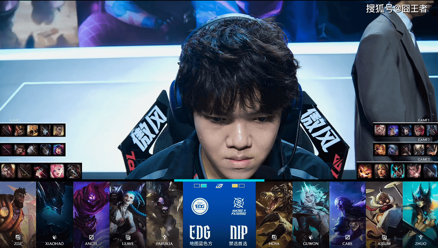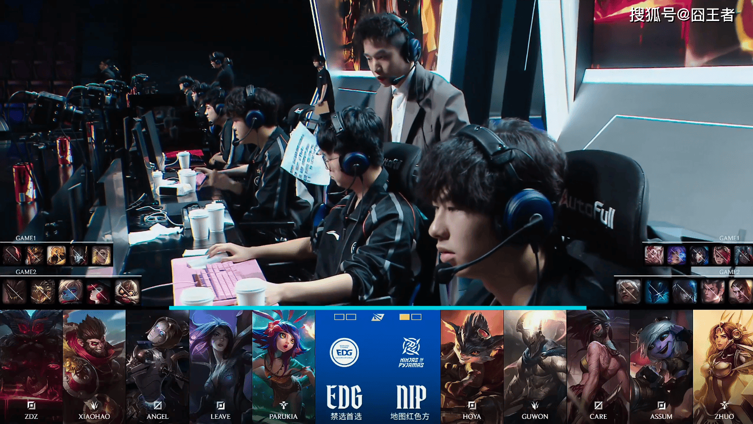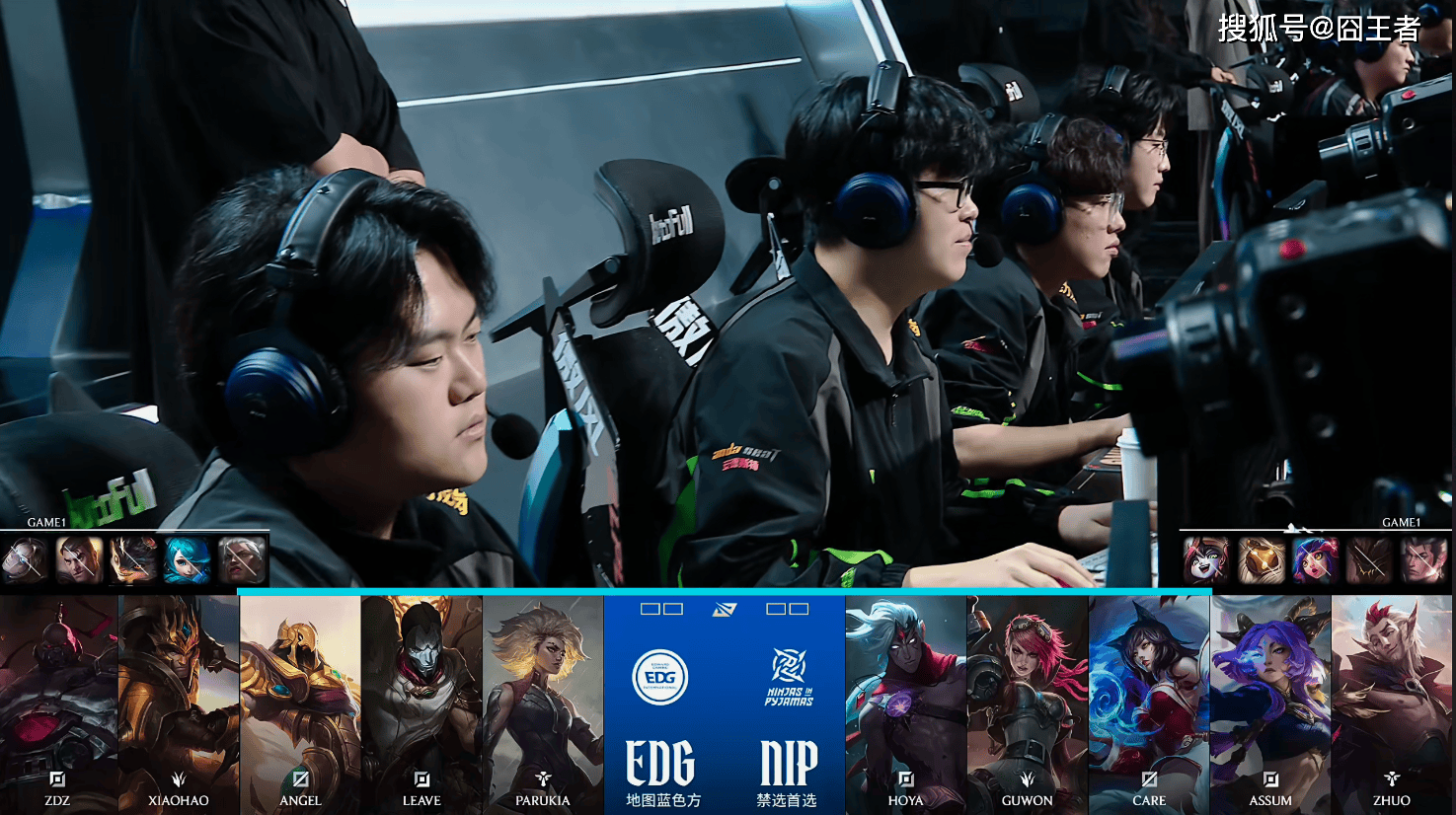 第一局比赛,NIP蓝色方,禁用:赵信,石头人,妮蔻,巴德,璐璐,选用:Hoya韦鲁斯,Guwon蔚,Care阿狸,Assum芸阿娜,Zhuo洛;EDG红色方,禁用:发条,杰斯,兰博,格温,狼母,选用:ZDZ塞恩,Xiaohao皇子,Angel沙皇,Leave烬,Parukia芮尔