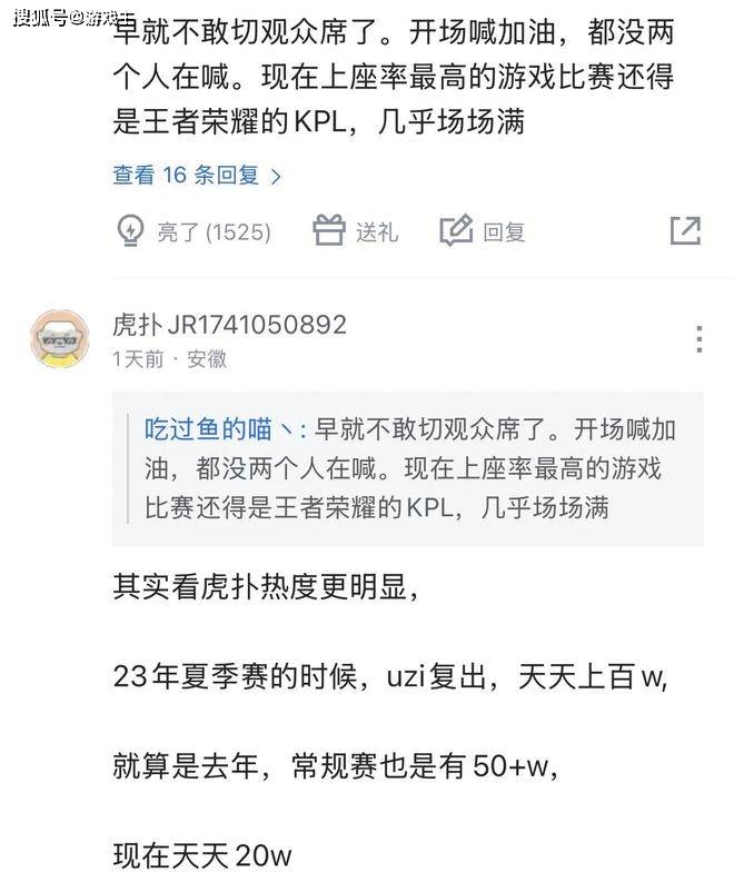 而且如果看了比赛的玩家,应该能够感觉到现在的开场加油声都已经没有几个人了,之前甚至各大战队还能够有划分,比赛之间还出现过两个阵营的互相呐喊,甚至还有第三阵营的lgd。现在有的时候听加油声都是同一批人,而且声音非常的洪亮相似,感觉就像是在话筒边喊的一样。说实话,近几年热度最高的时候应该就是S13赛季夏季赛uzi复出,当时基本上每天都是百万热度,常规赛也是座无虚席。现在的数据基本上已经下到了20w左右了,波动的太严重。