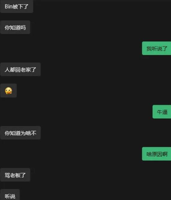场外有多方爆料显示,Bin疑似心态爆炸,已经跑路回家了。