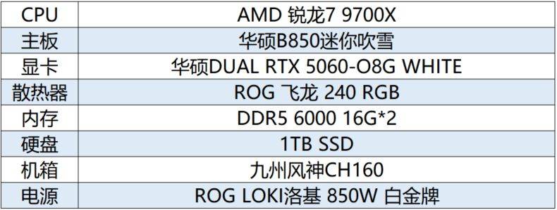 接下来给大家推荐一套白色主题ITX电竞小钢炮。以华硕ROG B850迷你吹雪主板为核心,搭配AMD锐龙7 9700X处理器、华硕DUAL RTX 5060 O8G WHITE显卡等高性能硬件,高帧畅玩无压力!