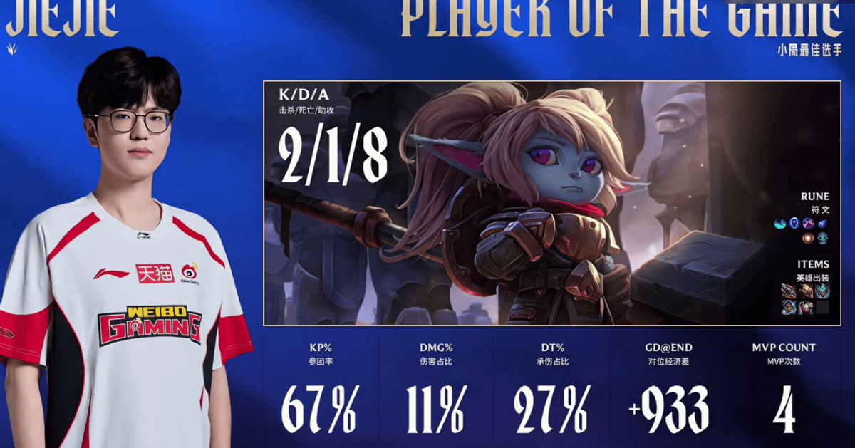决胜局中,JDG本已掌握主动,听牌龙魂,眼看胜利在望。然而,JDG的核心射手Gala在一次略显冒进的推进中与团队脱节,这转瞬即逝的破绽被Jiejie牢牢抓住。波比闪现出击,精准壁咚,瞬间秒杀了Gala的卢锡安。WBG随即打出0换2并拿下大龙,一举扭转了前期劣势,并最终走向胜利。这份从容,或许部分正来源于他与Junjia之间微妙的“血脉压制”。