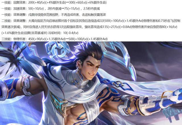 大禹加强:1技能的加速和回血增加,1技能新增范围视野,移除1技能的伤害和其他效果。2技能新增伤害和击飞效果,3技能的伤害增加。