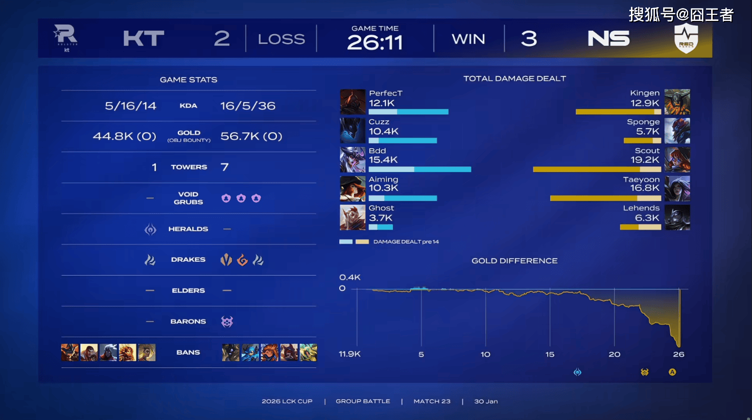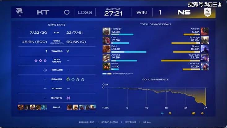 结果第一局比赛,KT没有展现出强势,反而是NS完成了碾压局。5分钟左右,芸阿娜在下路拿下一血,随后NS拿下小龙;12分钟左右,NS下路四越二先后击杀泰坦、蔚,前期优势明显;17分钟左右,妮蔻进场被秒,后续剑魔赶来也被击杀;17分钟左右,NS野区掉点后中路反打,成功完成一换五团灭;21分钟左右,NS下路开战打出0换3;24分钟左右,NS拿到大龙后果断留人,完成一波一换五;最终27分21秒,NS敌方高地开团完成1换5,随后顺利一波