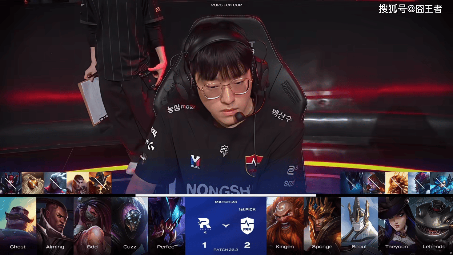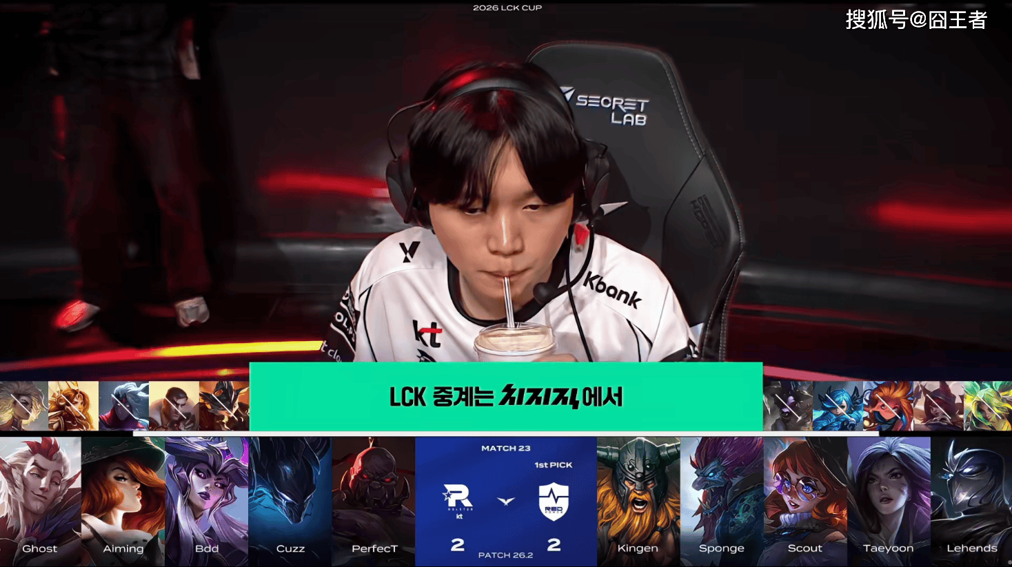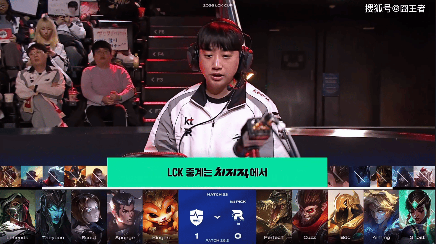 第一局比赛,KT蓝色方,禁用:兰博、发条、杰斯、鳄鱼、格温,禁用:PerfecT狼母、Cuzz蔚、Bdd岩雀、Aiming飞机、Pollu泰坦;NS红色方,禁用:石头人、沙皇、韦鲁斯、月男、布隆,选用:Kingen剑魔、Sponge潘森、Scout瑞兹、Taeyoon芸阿娜、Lehends妮蔻