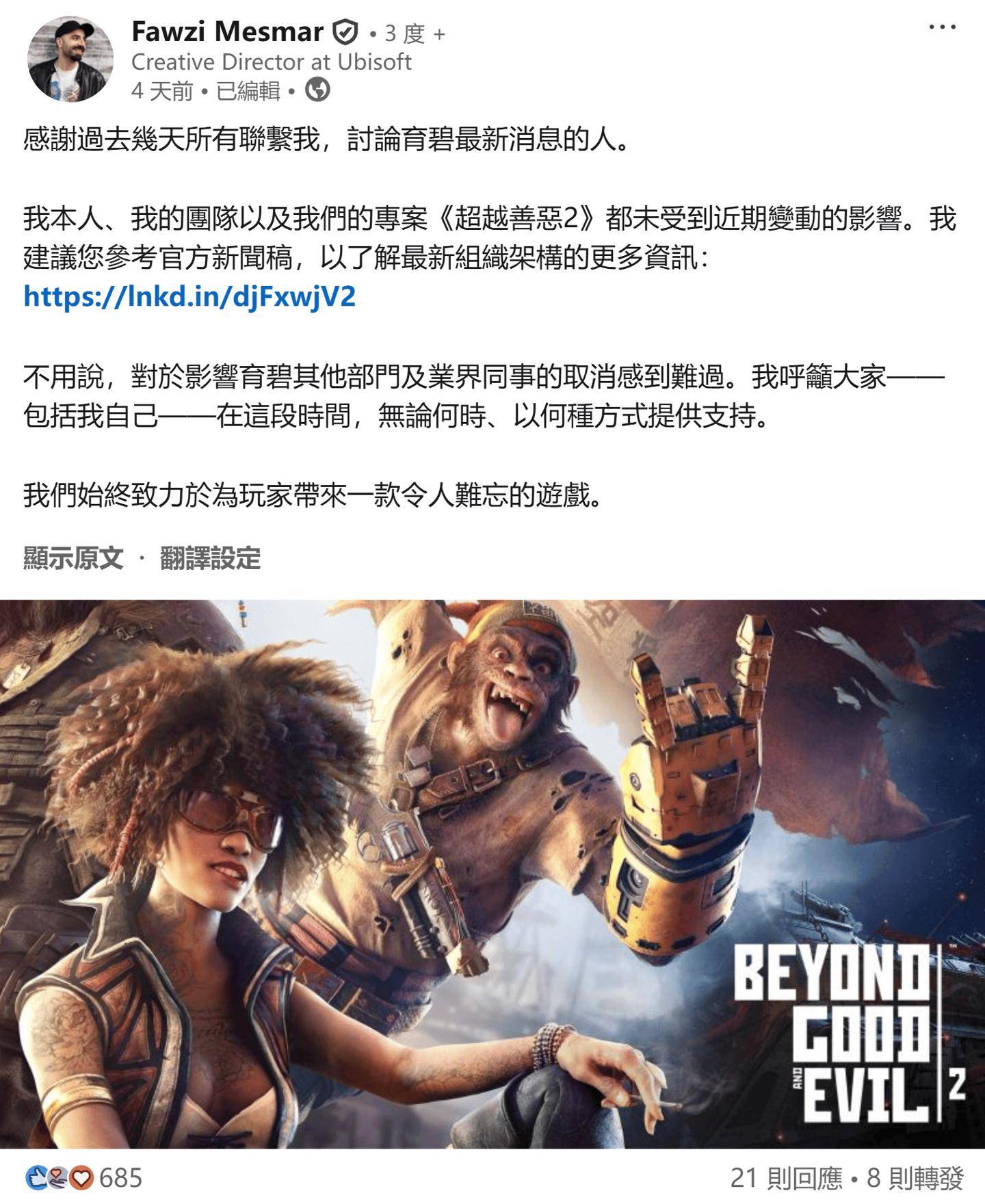 我本人、团队以及《超越善恶 2》项目均未受到近期变动影响。我建议大家参考官方新闻稿以了解最新组织架构消息。