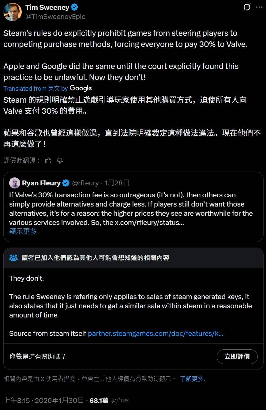 IT之家 1 月 30 日消息,Epic Games CEO 蒂姆 · 斯威尼今天在 X 平台发文,公开批评 Steam 平台的支付规则,称这些规定禁止游戏引导玩家使用更具竞争力的其他支付方式。