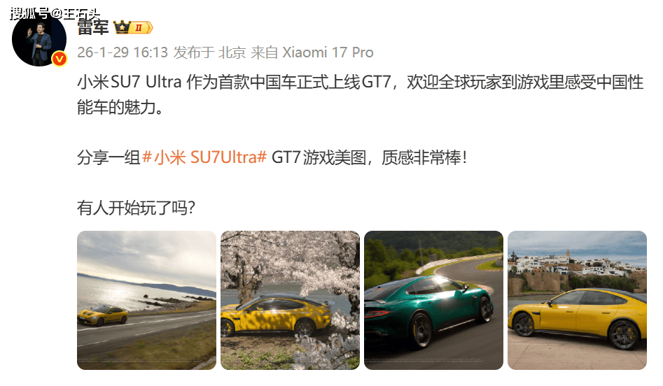 就像雷总自己说的,小米SU7 Ultra是作为首款中国车正式上线GT7,能让全球玩家充分体验到中国汽车的实力和魅力。