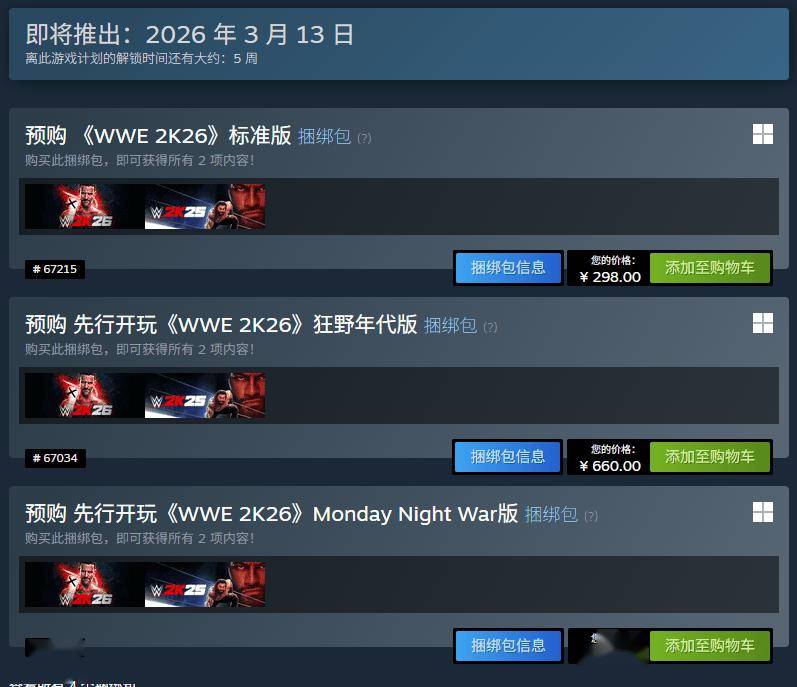 其中,标准版计划于 3 月 13 日上市,Steam 国区售价为 298 元;而“狂野年代版”和“Monday Night War”版则提前于 3 月 6 日发售,分别为 666 元、760 元。
