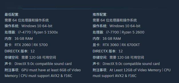 配置要求方面:本作最低要求 i7-4770 或 R5 1500X 处理器、RTX 2060 或 Radeon RX 5700 显卡、16GB 内存及 120GB 硬盘空间;推荐使用 i7-7700 或 R5 2600 处理器、RTX 3060 或 Radeon RX 6700XT 显卡,并至少 12GB 显存。