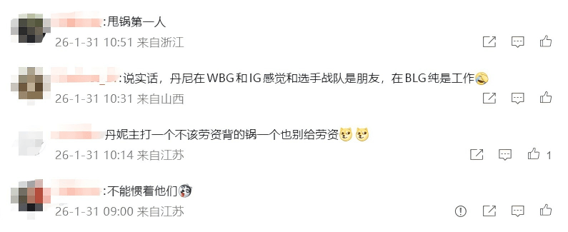 因此,丹妮这个采访反倒是给他自己招黑了:“说实话,丹尼在WBG和IG感觉和选手战队是朋友,在BLG纯是工作”,“丹妮永远是没问题的,去年被贴脸喷bp,说bp是一起做的”,“腊鸡教练,赶紧走,别坑我blg了行吗?!”……