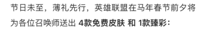 LOL官方春节放大招,只要期间上线打游戏,将送出4款免费皮肤,老玩家心里其实都清楚,《英雄联盟》一年里真正最“香”的时间点,永远绕不开春节,不是因为版本强弱,也不是职业赛多热闹,而是,这段时间官方是真的肯掏家底,很多平时你嫌弃“也就那样”的皮肤,一旦挂上“新春”“限定”这两个字,立刻就变成错过等一年的存在,今年马年这波活动,更是把“白嫖友好”四个字直接拉满。