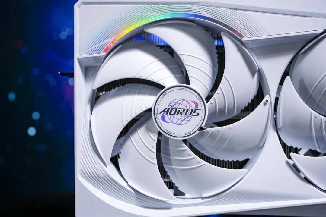 外观设计上,依旧是纯白的配色,和上面提到的两款技嘉产品很搭。正面有棱角分明的边框和风扇边的彩色条纹做装饰,整体给人的印象非常简洁硬朗。侧边的“AORUS”标志旁配备了一块小的显示屏,点亮后除了可以显示一些显卡的运行信息外,还可以显示自定义的文本、图片和GIF。