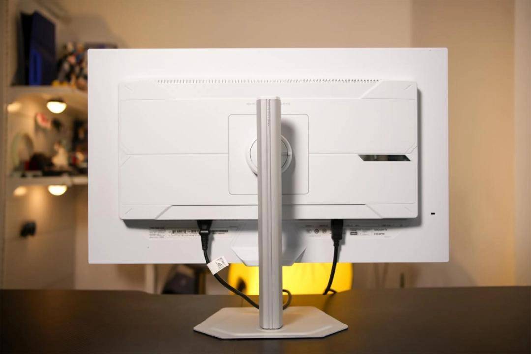 光看外观设计它就已非常讨喜。正面三窄边的边框带来了不错的屏占比,也拉近了游戏画面与玩家的距离,能然你获得极佳的画面沉浸感。纯白色的面板加上表面防滑纹路的处理和中间显眼的技嘉品牌LOGO,也让这台显示器兼具了颜值与辨识度。