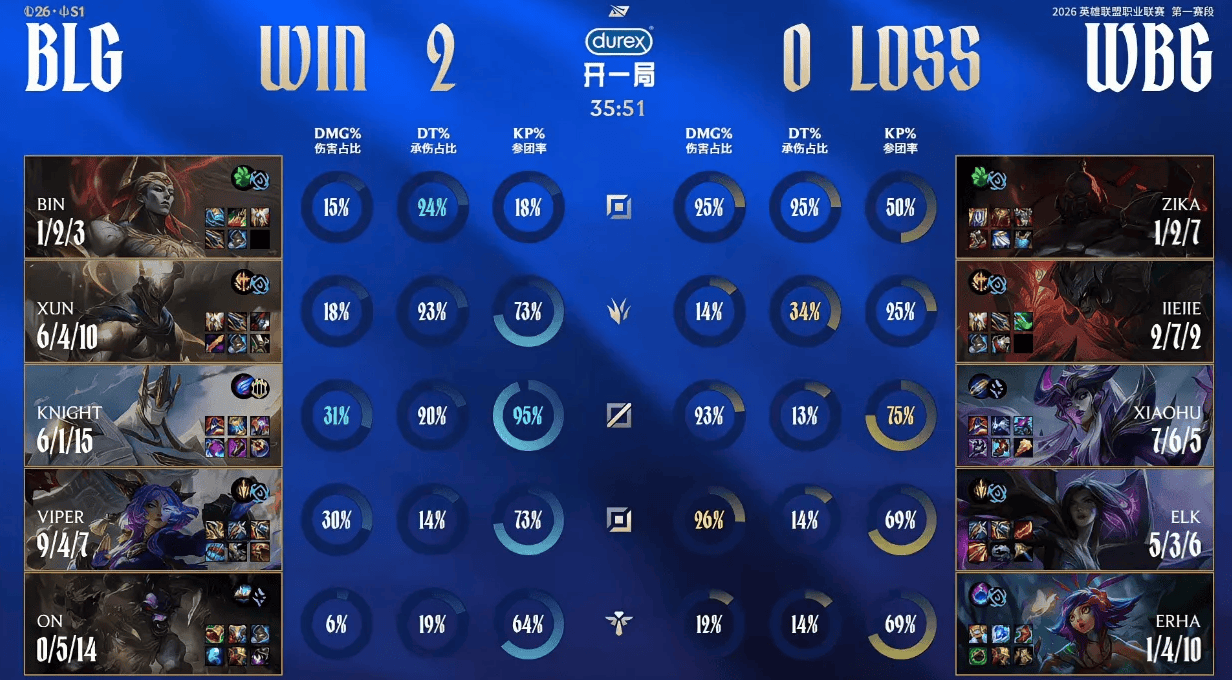 到了第二局,jiejie的剑魔看着让人难崩,搞科研开发i7,也不知道是熟练度不够还是BP问题,被对面打成了突破口。但有一说一,BLG技能施放很到位,打团的控制链几乎拉满了,打得对面毫无脾气,最后2-0拿下WBG。