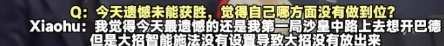 而在赛后xiaohu把这次失误归咎于大招智能施法没有设置,那么问题来了,比赛开打前不是给选手时间去调试设备吗?既然能上赛场就要认真对待,这是一名职业选手的基本素养。