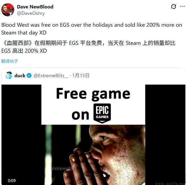 也就是说Epic游戏商城向玩家免费赠送游戏确实是一种高效的获客手段,可引流来的玩家并没有养成在平台消费的习惯。甚至还出现了让人啼笑皆非的一幕,今年1月独立游戏《Blood West》的发行商曾表示,这款游戏去年12月曾在Epic游戏商城进行一日限免,但在Epic游戏商城白送游戏的当下,竟然意外带动其在Steam的销量激增200%。