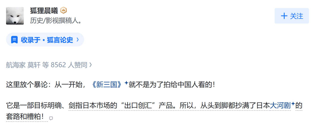 虽然大多数网友还只是抱着看笑话的心态,在鉴赏新《三国》的搞笑名场面。但有没有一种可能,其实在我们注意不到的地方,新《三国》早就已经影响到了某些人对于三国这段历史的认知了。