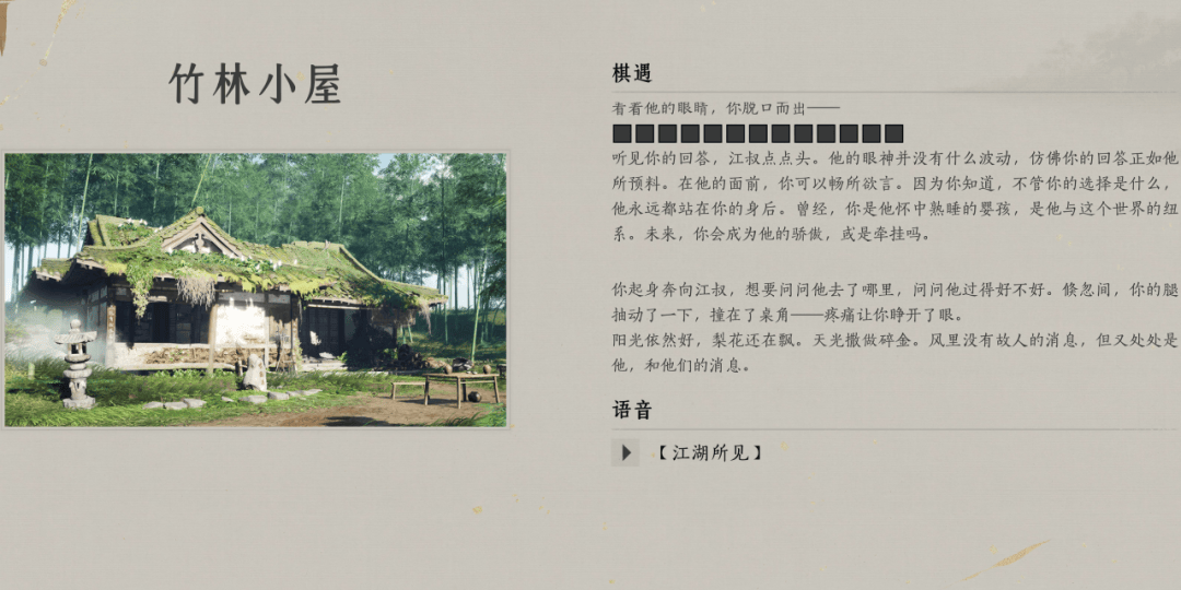 在棋局中,玩家以竹隐居(游戏最开始的地方)为目标终点,用奇术和门派技能抢先到达终点。过程中,玩家会碰到故友旧敌、相识旧地;积累足够的回忆后,还可以在「江湖棋遇」中开启棋遇,将回忆联结起来,汇聚成这一年的江湖路。