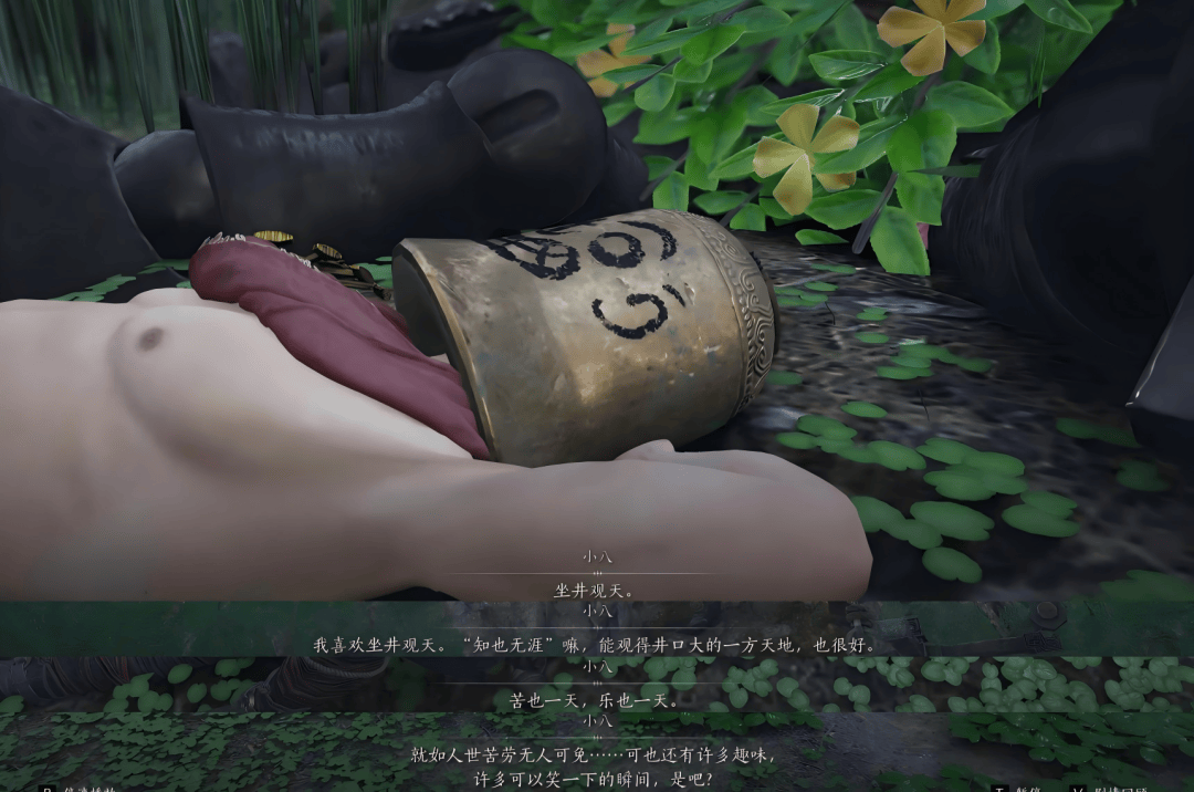 关卡结尾,玩家会和小八一起坐在一个纵深的山洞底部,山洞顶端有个不大的洞口,就像个深井一样。他在朋友圈里说,这个画面让自己想起一个故事——有一条小鱼,总是寻寻觅觅,有一天它找到了一条大鱼并问:「我怎样才能进入大海?」大鱼回答说:「其实你一直就在海里。」