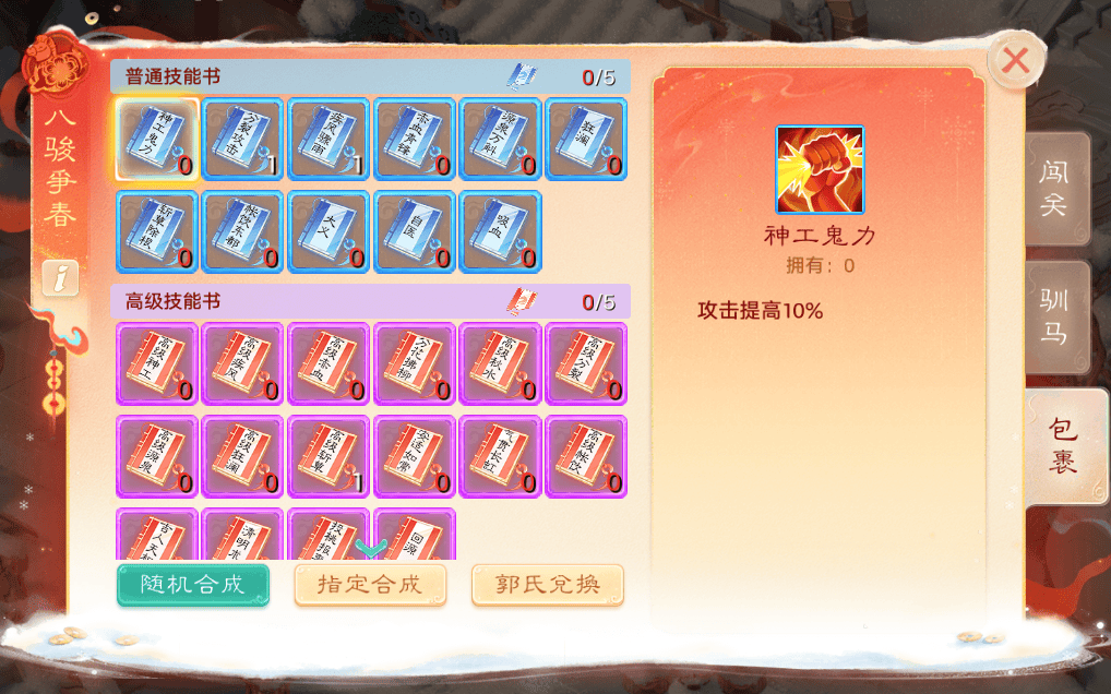 八骏争春闯关的核心要点,是要搭配好良驹和技能,以及提升照夜等级。每闯关一个关卡,可获得相对应经验值进行升级,还会获得驯马术残卷,可用于合成随机技能书。