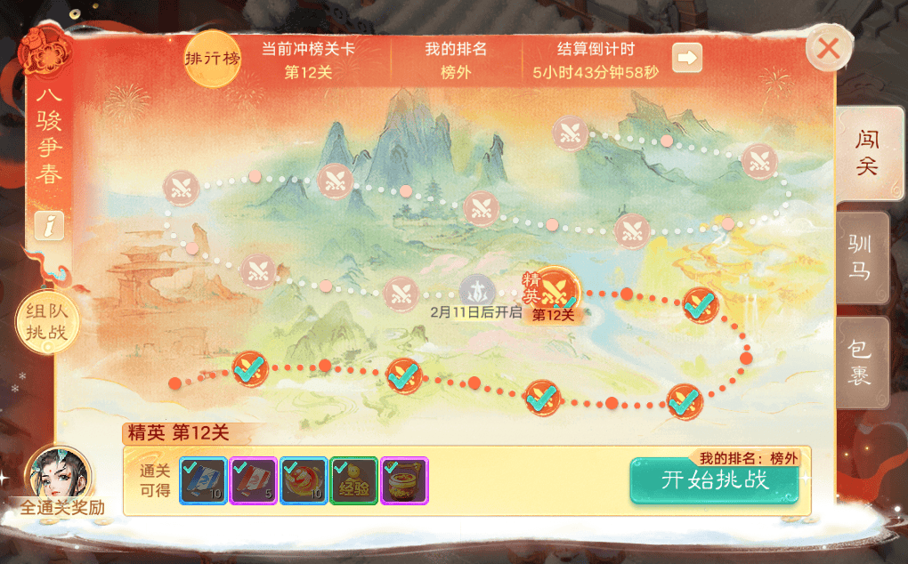 叶子猪今天体验了一下,八骏争春·闯关难度并不高,角色等级≥80级,单人活动,开放时间是2月5日维护后~2月24日,每关为独立战斗副本。