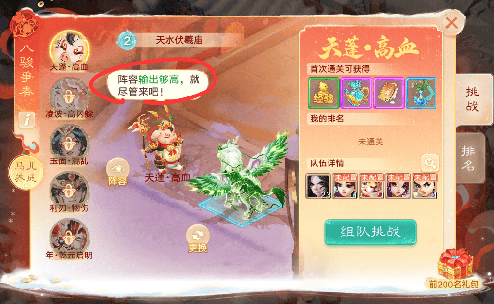 这个八骏争春·挑战难度较高,但与此同时奖励也很丰富,大家可以根据自己队伍实际配置情况进行挑战,比如“翻羽+雷法”组合通关率超92%,是当前最稳定速通流派。