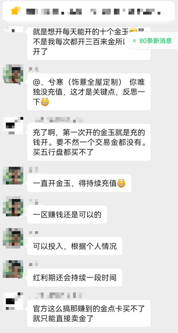 如果想要收益更大化的话,还可以花300元宝买金玉,金玉每天限购10个,10个金玉差不多能开出300-500金,300金大概能赚50块,也就是说每天投入30块就能赚50块,一个号净收入20,一个通行证可以建五个号,五个号的话一天能赚100,多开的话一个月轻松月入上千。