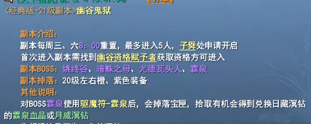 副本的话,周三周六必刷!21级可进日钻本(幽谷鬼狱),击败BOSS霖泉有机会掉宝匣,开出日藏溟钻或月威溟钻(可交易),一个能卖几十到上百金币。世界套副本掉落各部位世界套,寄售价从几百金到1.5万金不等,比如60级藏金阁副本的燕南天腰带,运气好能卖上千!