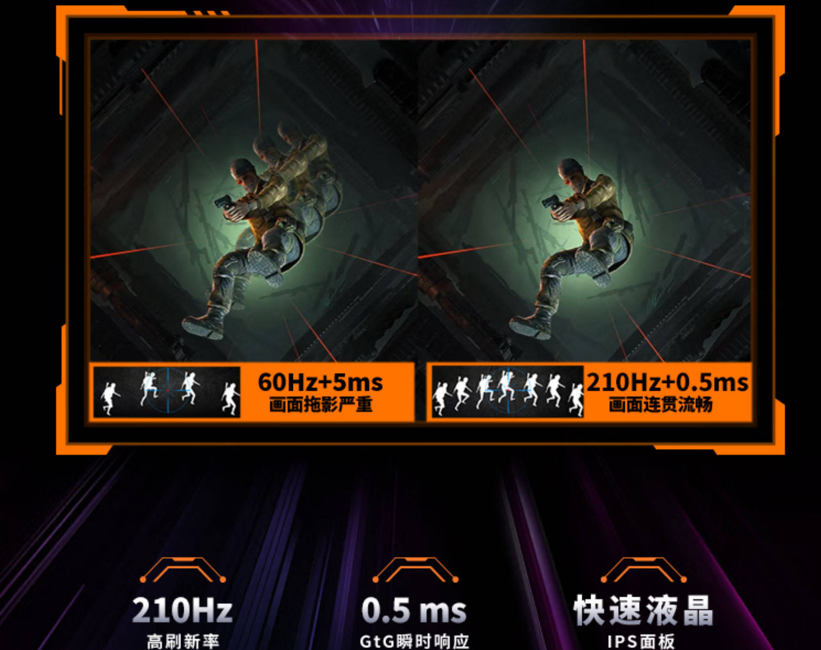 显示器采用快速IPS面板,原生响应时间低至1ms(GTG),搭配微星独家的Overdrive加速技术,能够进一步缩短响应时间,有效消除画面拖影与鬼影,让玩家在高速移动的场景中,也能获得清晰流畅的视觉体验,提升瞄准的精准度。此外,这款显示器还支持Adaptive-Sync同步技术,能够实现显示器刷新率与显卡帧率的实时同步,有效消除画面撕裂与卡顿现象,无论是高帧率还是低帧率场景,都能呈现出流畅的画面效果,能够充分发挥2K+210Hz的极致优势,让《三角洲行动》的画面体验更上一层楼。