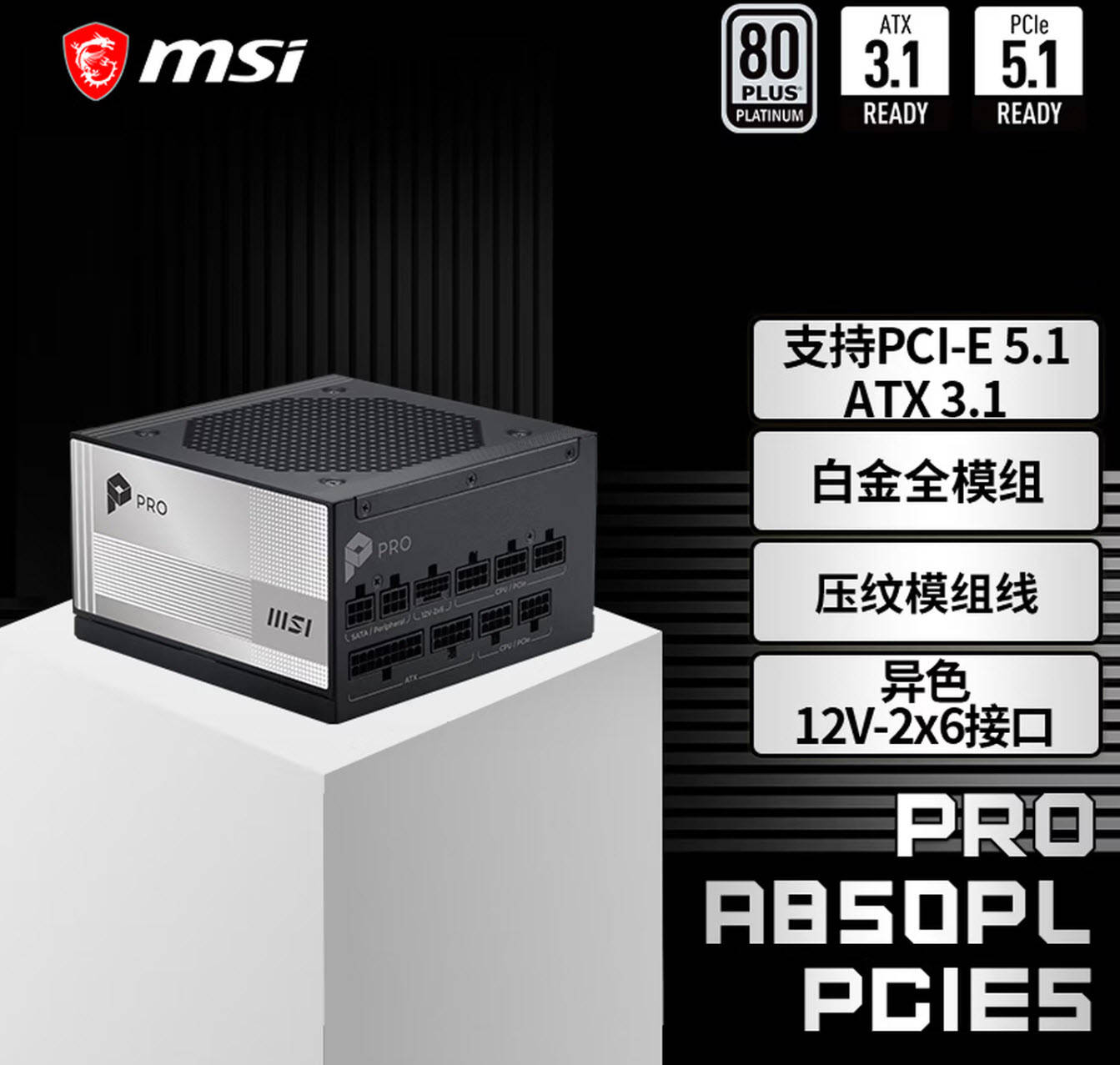 PRO A850PL PCIE5白金全模组电源,作为这套游戏全家桶的“动力源泉”,凭借80PLUS白金认证、强劲的功率储备、稳定的供电输出,为英特尔(intel)酷睿Ultra5 230F处理器、微星B860M迫击炮主板等所有硬件提供持续稳定的电力支持,确保整机在高负载游戏运行下的安全与流畅。这款电源隶属于微星PRO系列,定位性价比市场,外包装采用简约黑白风设计,正面清晰标注了产品型号、80PLUS白金认证、ATX3.1以及PCIe5.1等认证标志,直观展现了电源的核心优势。
