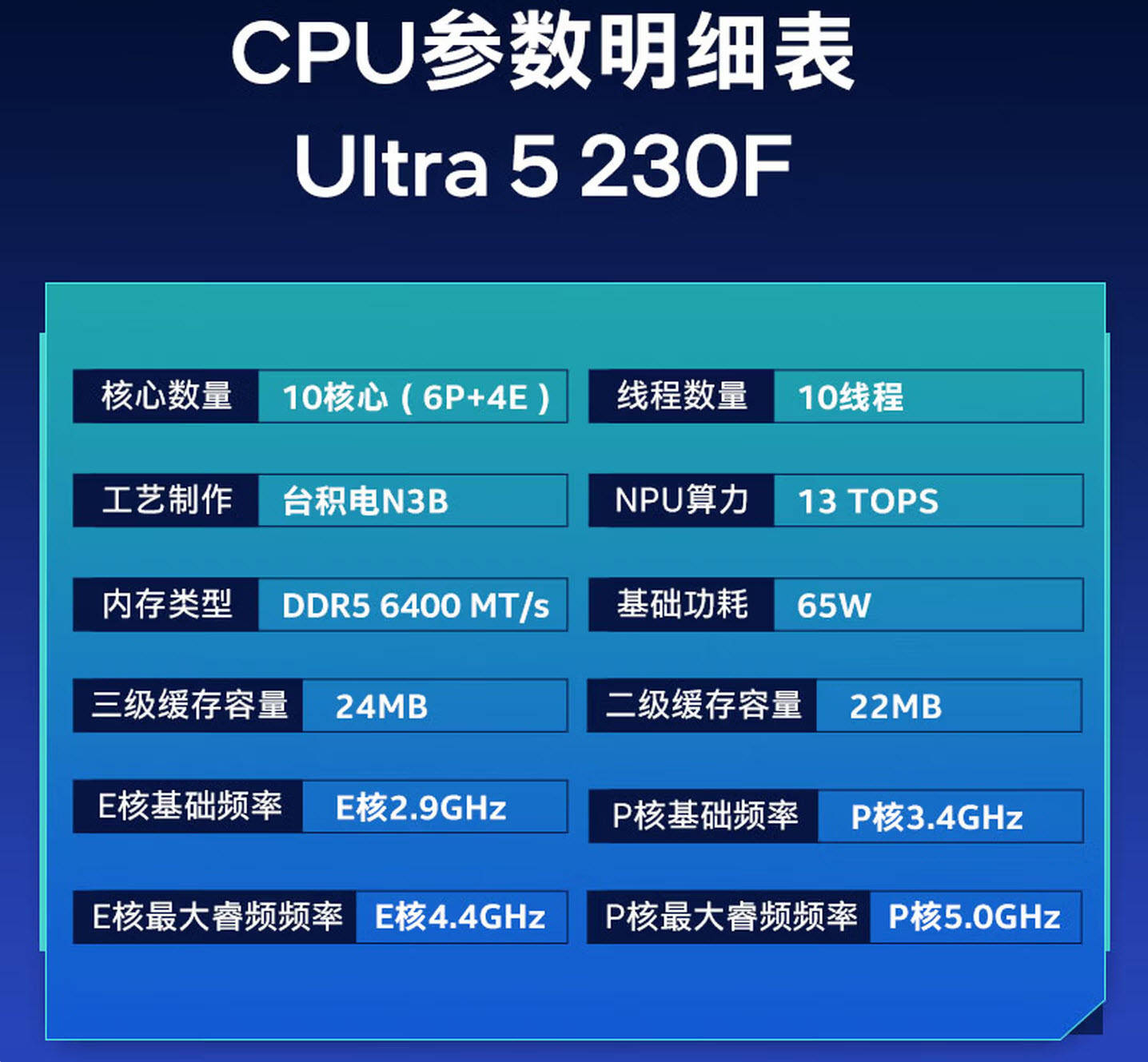 英特尔(intel)酷睿Ultra5 230F处理器,这款处理器采用TSMC N3B工艺打造,I/O模块则采用TSMC N6工艺,各个计算模块之间采用Die-to-Die直连,该处理器拥有10核10线程设计,其中包含6个性能核(P-Core)与4个能效核(E-Core),性能核采用最新的Lion Cove微架构,能效核采用Skymont微架构,核心排布从原先的P-Core与E-Core各自分区排布,转变为交替式排布,进一步提升了散热效率与性能释放的稳定性。同时,这款处理器的三级缓存提升至24MB,相较于同系列的英特尔(intel)酷睿Ultra5 225F提升明显,而三级缓存的增加,能有效提升游戏数据的读取与处理速度,对于射击游戏的帧率稳定性有着直接的提升作用。