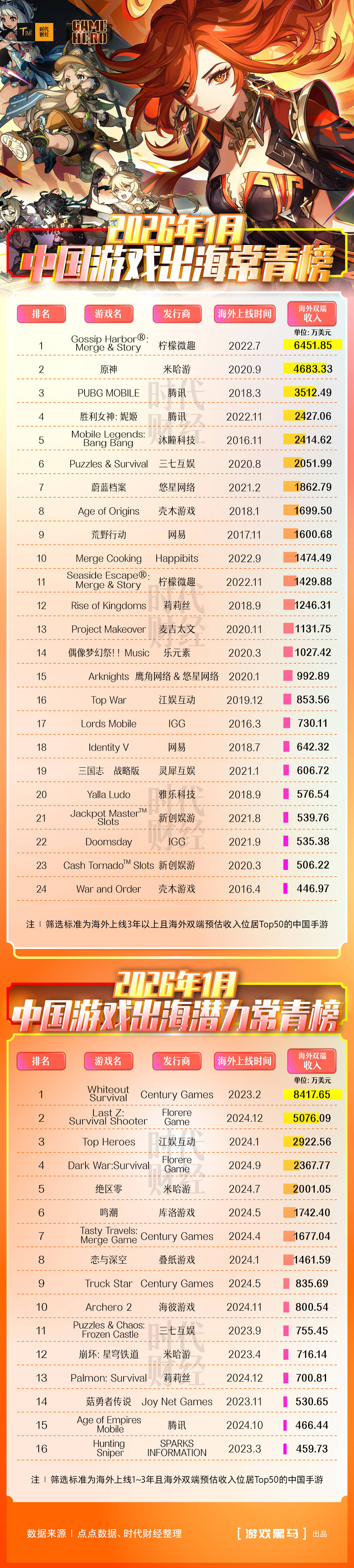 据统计,2026年1月共有《Gossip Harbor®: Merge & Story(下称“Gossip Harbor”)》《原神》《PUBG MOBILE》等24款游戏入围《出海常青榜》;同时,有《Whiteout Survival》《Last Z: Survival Shooter》《Top Heroes》等16款游戏入围《出海潜力常青榜》。