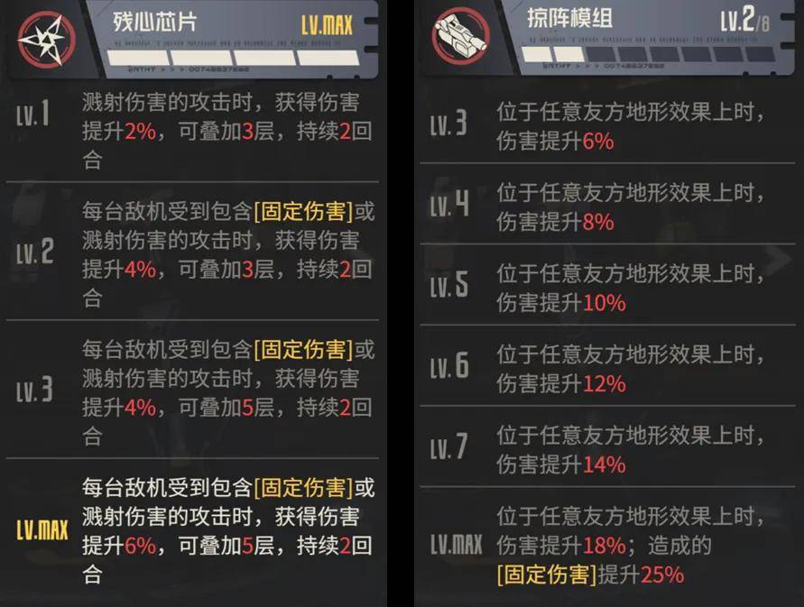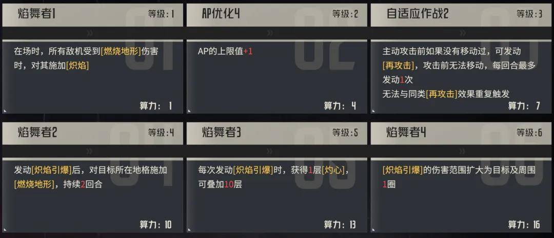 接着是阿黛勒的γ2区特性,其中每个算力上限的效果看起来都不错,整体依然是围绕着“炽焰”的施加和引爆伤害+引爆范围而设,所以γ2区肯定也是阿黛勒的关键质变区域,毕竟这位角色主打的是一个群体连锁爆炸固伤,所以对单的“最佳射程”伤害估计在其适宜的战斗场景中应该不会是其核心伤害的来源。