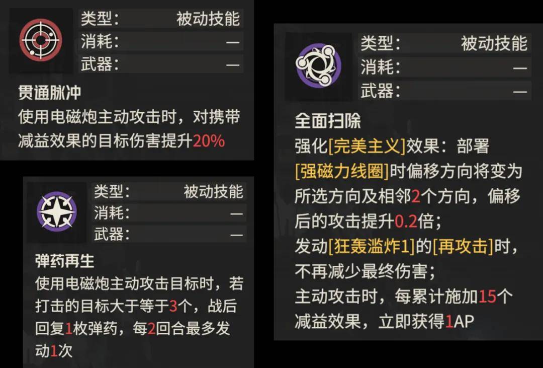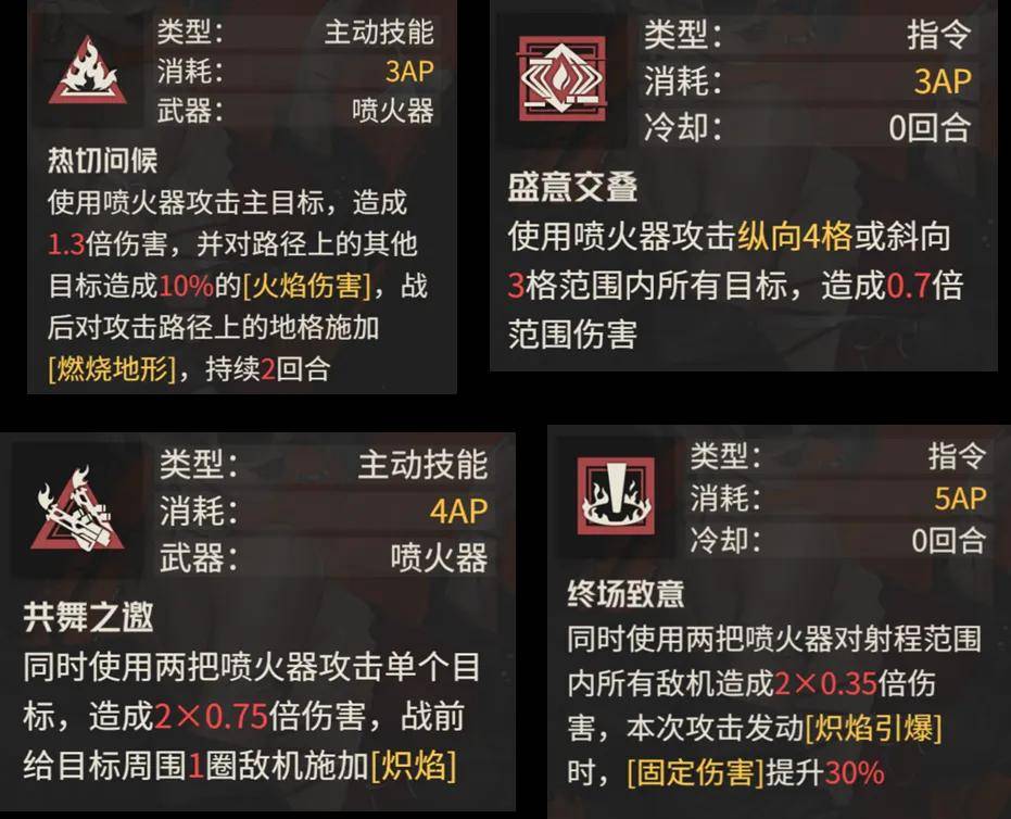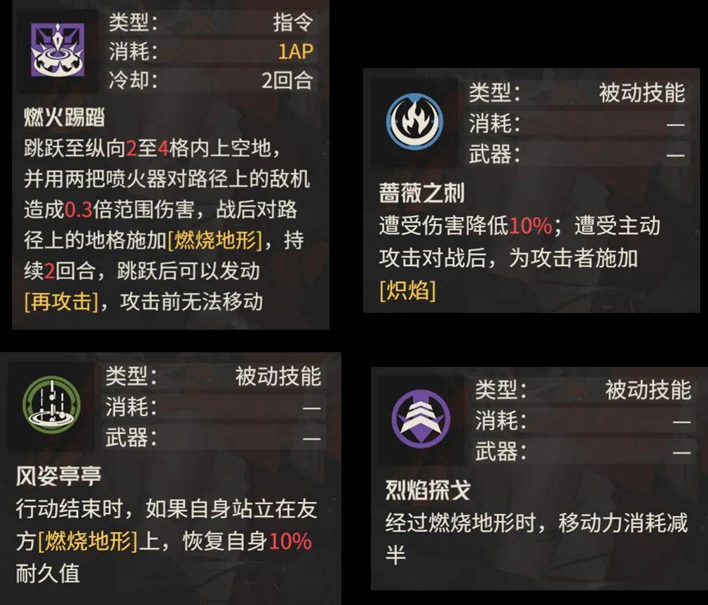 最后剩下的4个技能中,这个跳跃技能倒是挺有意思的,且跳跃后除了伤害还能发动原地再攻击,仅仅1AP的消耗估计也给这个技能带来了不小的性价比,此外经过燃烧地形可以减少一半消耗的移动力,这点配合友方估计也能给阿黛勒带来不低的战场覆盖能力,毕竟重甲再带一个移动背包本身移动力也不算很差。