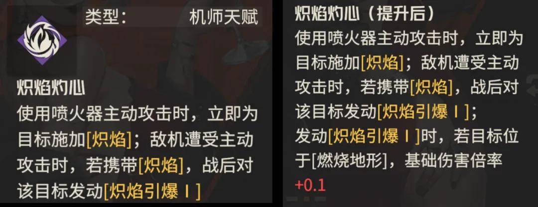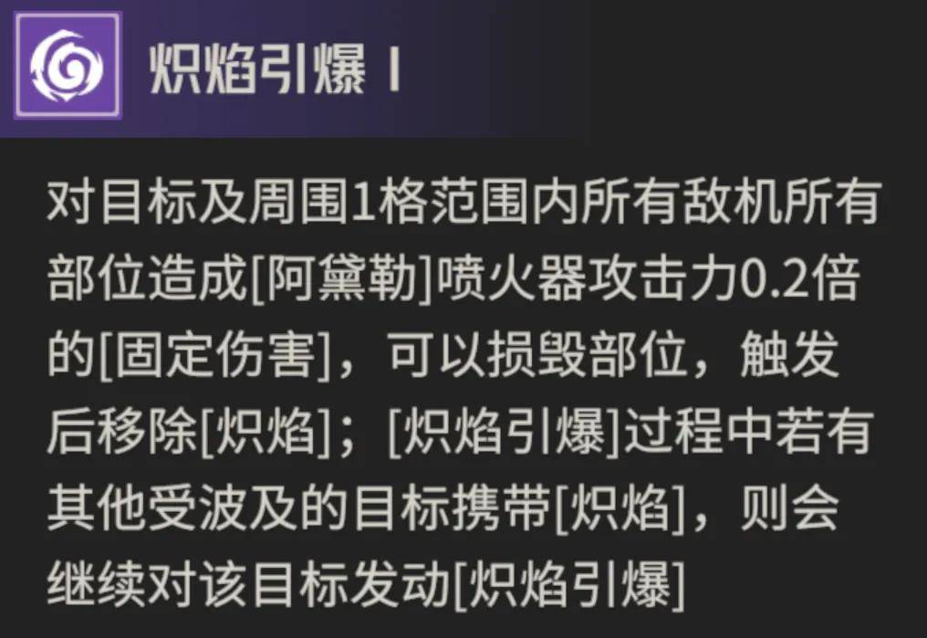那么作为一位主拿喷火器攻击的角色,阿黛勒的这个天赋是一个主打固伤的天赋,这点就很难直观的看出其伤害的高低了,后续我们再做实测来分析阿黛勒的伤害,而阿黛勒3潜能提升的点就在于引发固伤时若敌方处于“燃烧地形”地形上,则还会额外提升0.1的伤害倍率,相当于从0.2的基础倍率提升到0.3,这个提升幅度仅对固伤这部分来讲还行,但后续得再看看固伤到底能占得了阿黛勒总伤害的多少比例。