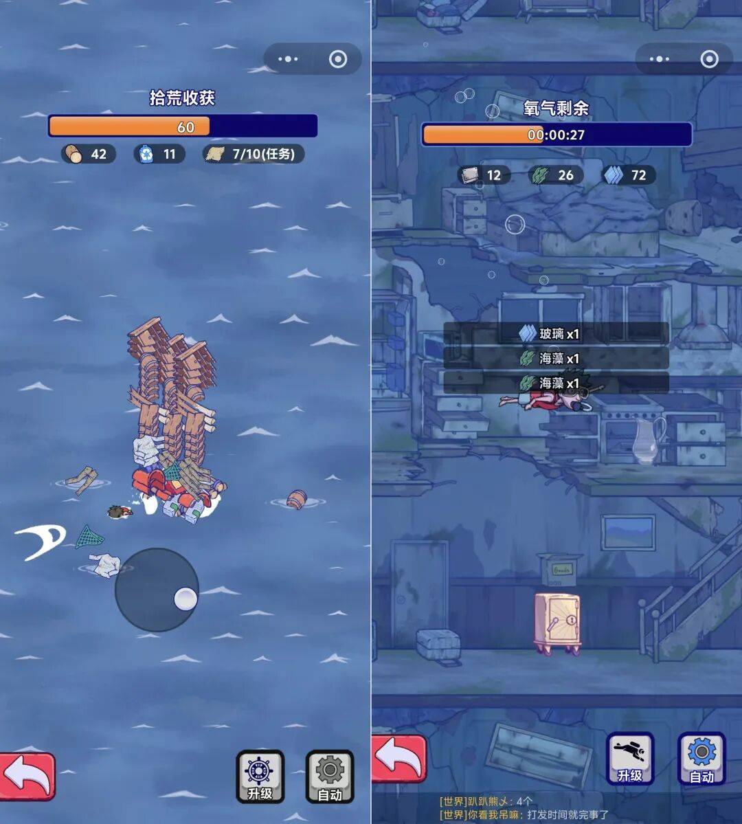 进入海底探索时,玩家可以控制角色穿行在被淹没的高楼里,同时搜集藏在其中的铁片、玻璃和海藻,不过氧气有限,在氧气耗尽后就要立刻结束探索。