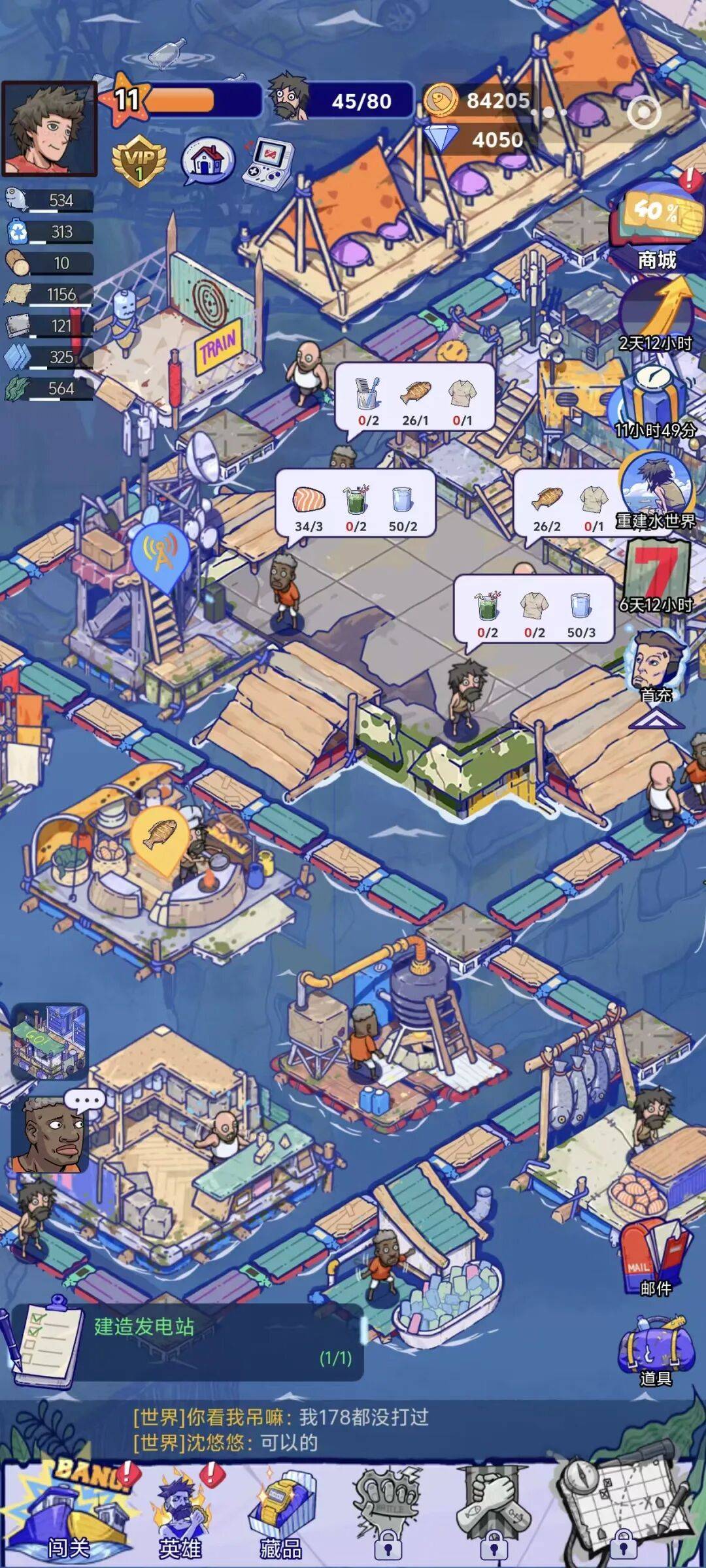 收集来的资源,主要会将用于后续的建筑搭建和产品制作。游戏中设计了丰富的建筑种类,其中居民住宅、发电站、医院等生活建筑,主要用于提高人口数量;切鱼厂、海水提取厂、服装作坊、日用品厂、金属厂等生产类建筑,当然是用来生产各类产品的;在此之外,还有许多其他的功能性建筑,比如仓库用来储存各种原料、指挥中心用于英雄委任、训练营用于产出英雄经验等等。