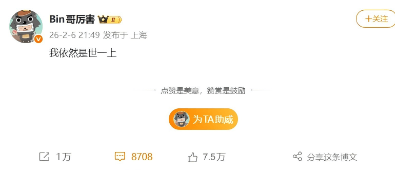 2月6日晚,因中单Knight与辅助ON的糟糕发挥,BLG以1-2不敌AL。原本赛后舆论都在指责Knight这么多年没练出一个沙皇,以及ON依旧没改掉有优势就浪、就送人头的坏习惯。可谁也没有想到,上单选手Bin突然发了一条名为“我依然是世一上”的微博,直接引来百万关注、超7.5万点赞,上万转发。