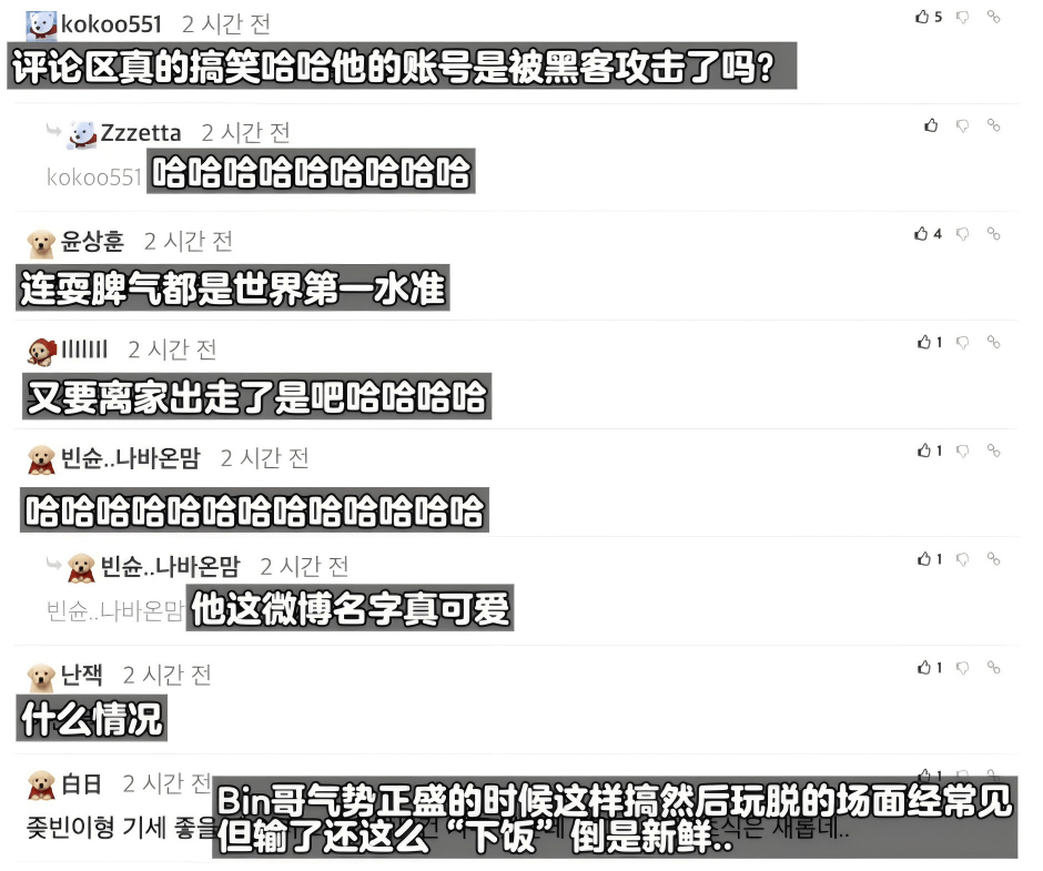 很多网友都觉得这条言论怕不是Bin被黑客盗号了,已经超出正常职业选手能发挥出的极限了,如果是赢了比赛这么说还情有可原,但输了比赛这么说,就不理解了;也有人觉得不论Bin的游戏操作水平如何,他耍脾气的水准绝对是世界第一,太帅了!