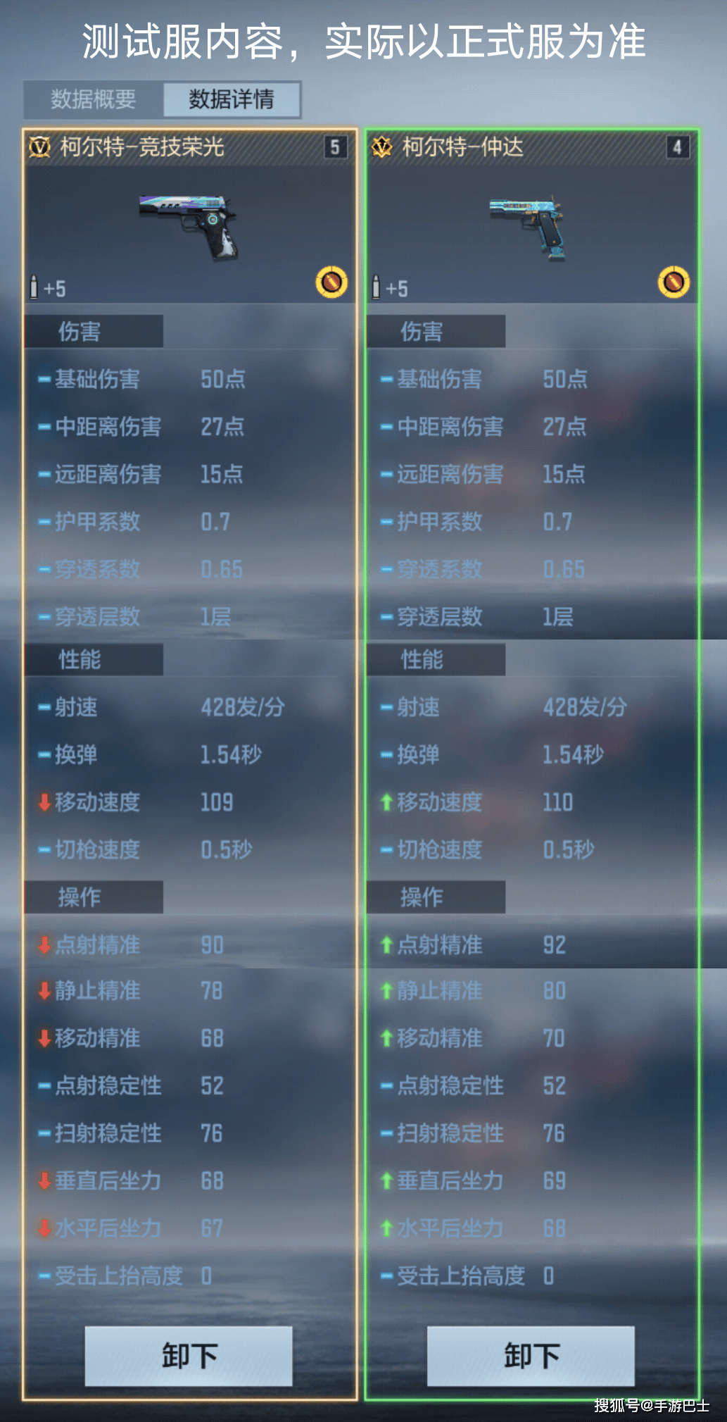 这里与同系列武器柯尔特-仲达数据对比后发现,柯尔特-竞技荣光在性能方面还是有点差距的,但是整体差距并不算太大。