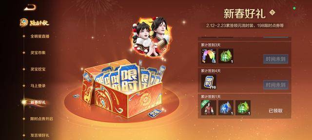 2月12日~2月23日期间累计签到四天,即可必得198限时点券,累计签到一天也能获得元流之子新春时装。