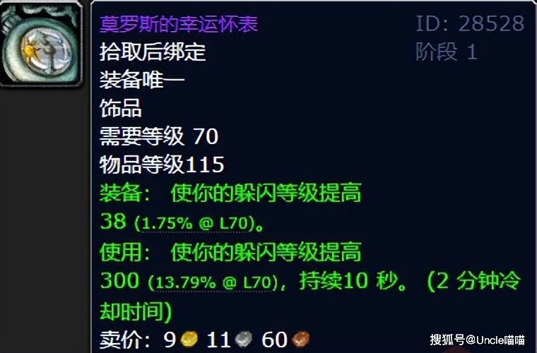 懂喵叔的玩家应该都知道,卡拉赞老二的莫罗斯幸运怀表是我的挚爱啊,毕竟这东西对于熊T的意义绝对是天花板水准的,他也是TBC版本将躲闪属性演绎到极限的饰品了,初期不挑T,后期抗压准神器的存在。当然怀旧服喵叔就比较脸黑了,熬了两个多月才给拿下他,就问问屏幕前还有没有比我更脸黑的大兄弟了?