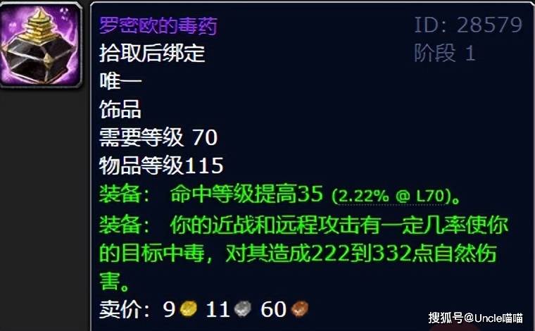 卡拉赞歌剧院朱丽叶掉落的罗密欧毒药,喵叔愿称他最性价比的补命中饰品了,一阶段你就可以遇见并拿下,特别是对于熊T和战士T两个职业,喵叔是尤为推荐大家入坑一款备用,到了中期配装的时候,你就知道什么叫容错率拉满了,像熊T的话,就可以直接跳过黑暗神殿的背叛者疯狂,喵叔是100%推荐各位大兄弟提前拿下的!