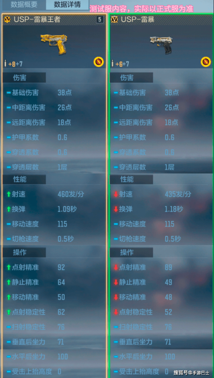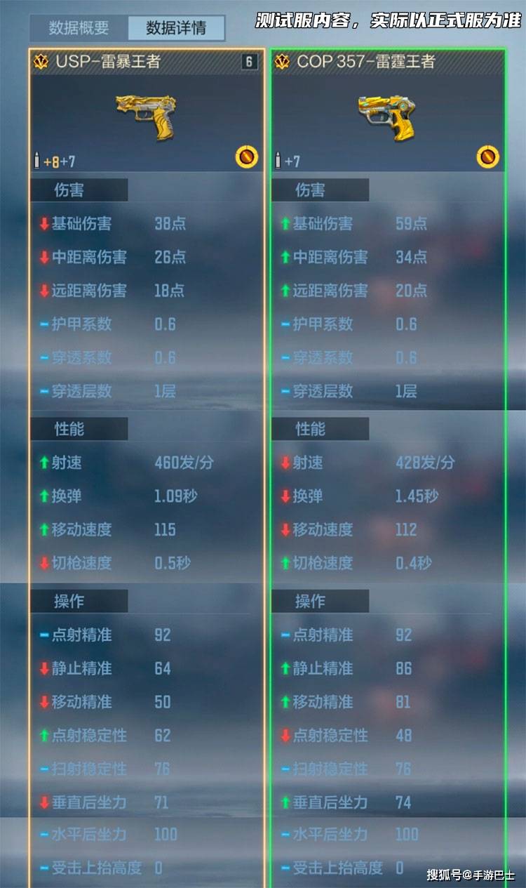 接下来是武器对比,首先和同类型的USP-雷暴作对比,伤害方面完全一致;性能方面,USP-雷暴王者在射速、换弹上占有绝对的优势;而操作方面在点射精准度、静止精准度、移动精准度、点射稳定性完全碾压。