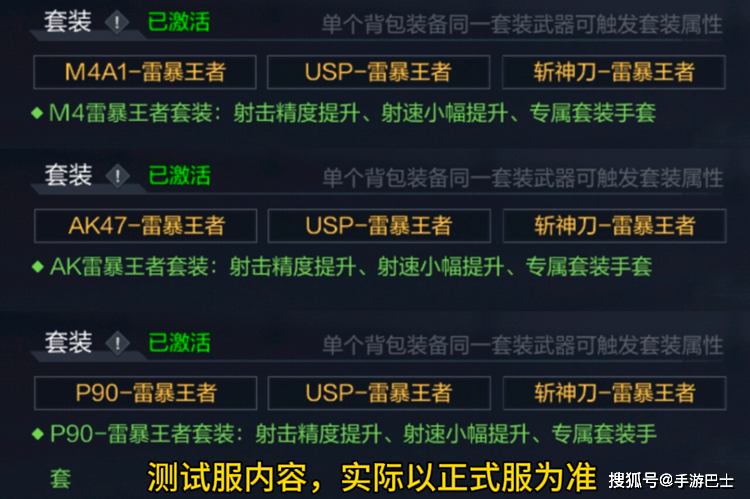 除了拥有专属的消灭图标和专属展示动作之外,USP-雷暴王者与斩神刀-雷暴王者、AK47-雷暴王者(M4A1-雷暴王者、P90-雷暴王者)装备同一个背包,还能触发套装属性:射击精准度提升、射速小幅提升、专属套装手套。