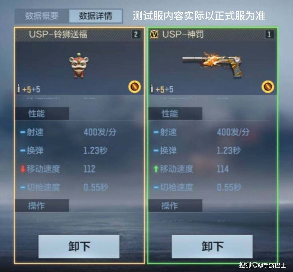 在核心性能参数维度,USP - 铃狮送福的射速(400发/分钟)、换弹耗时(1.23 秒)及切枪速度(0.55 秒),均与USP-神罚保持完全一致的水准。二者的性能差异集中体现在移动速度层面,USP-神罚的移动速度数值达到 114,相较于 USP-铃狮送福具备较强的机动性优势。